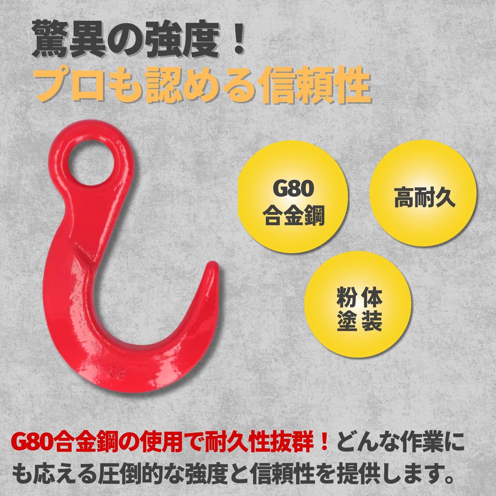 【高品質素材で信頼の強度】 本アイフックは、G80合金鋼を使用し、強度と耐久性を兼ね備えています。さらに精密鍛造と焼き入れ加工により、過酷な作業環境でも信頼して使用可能です。プロフェッショナルな現場作業にも耐えうる強靭なつくりです。