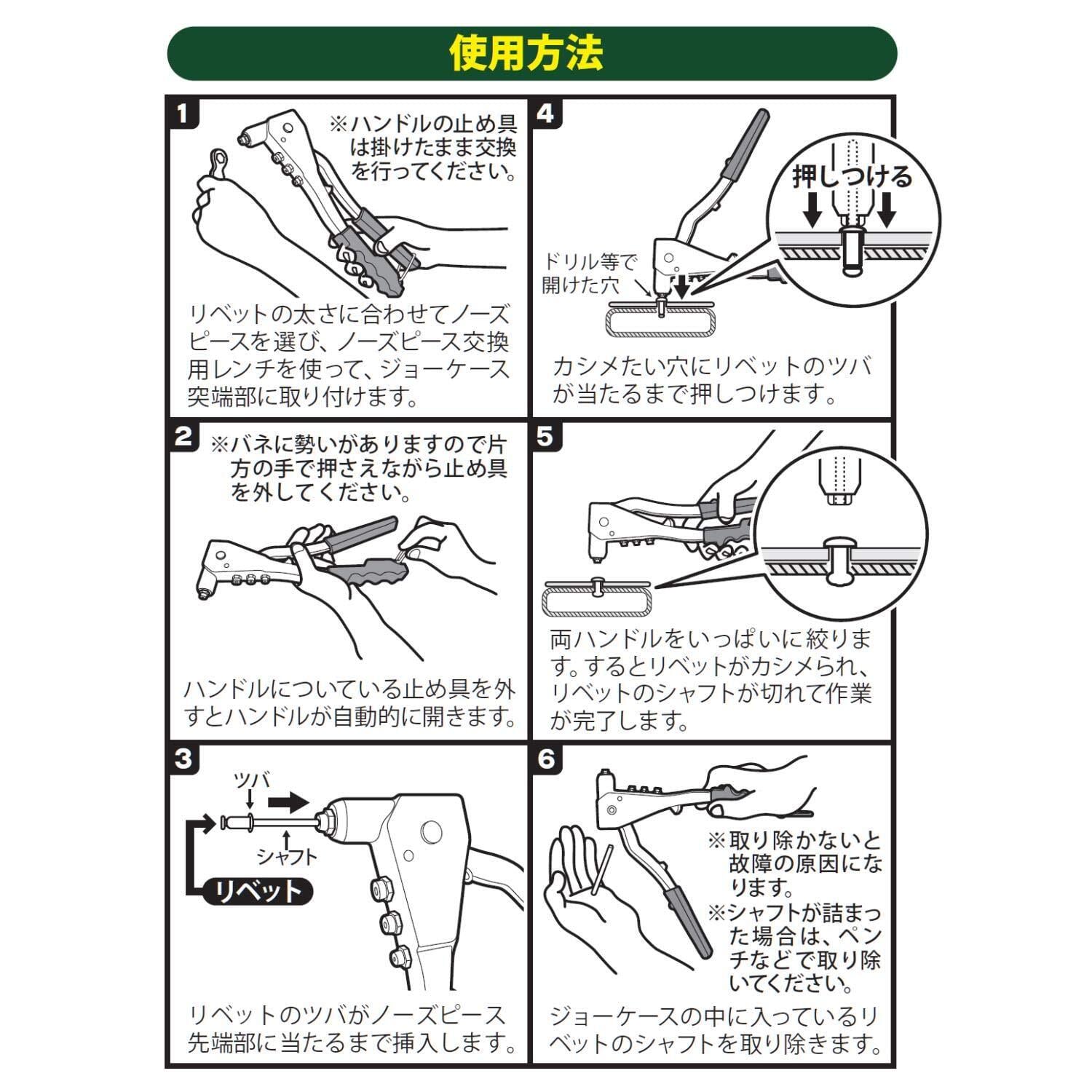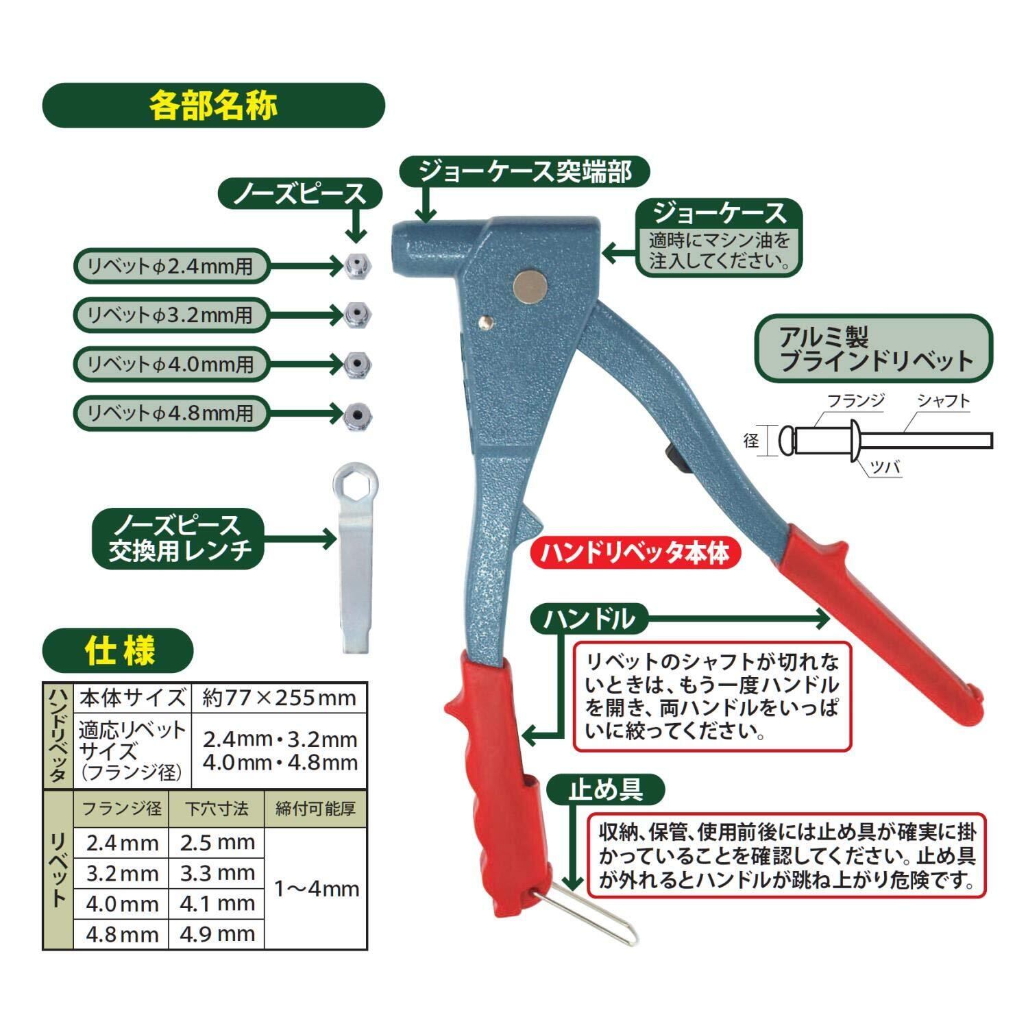 セット内容:ハンドリベッタ本体/1個、ノーズピース(2.4mm、3.2mm、4.0mm、4.8mm用)各1個、アルミ製ブラインドリベット(2.4mm、3.2mm、4.0mm、4.8mm)各15本、ノーズピース用レンチ/1個