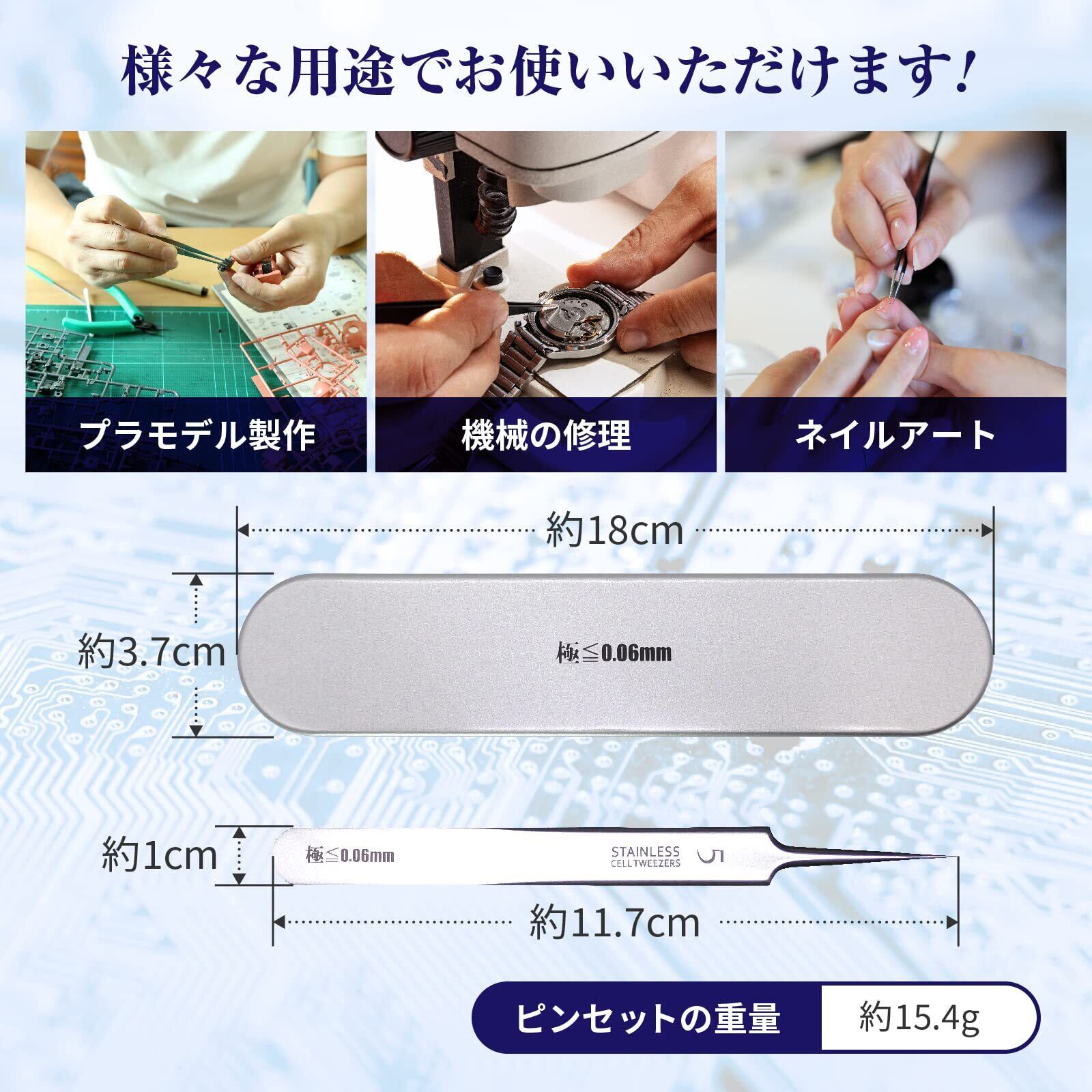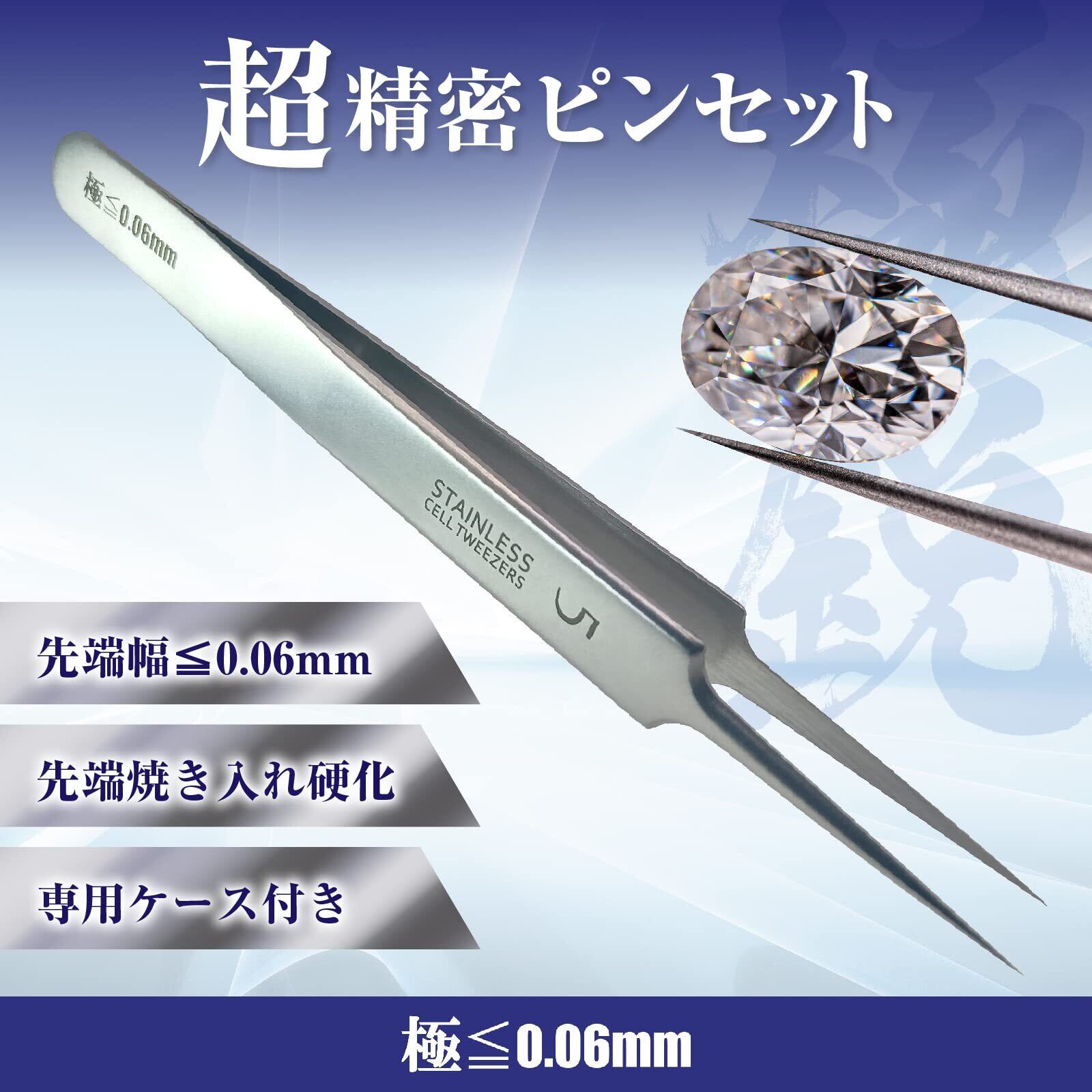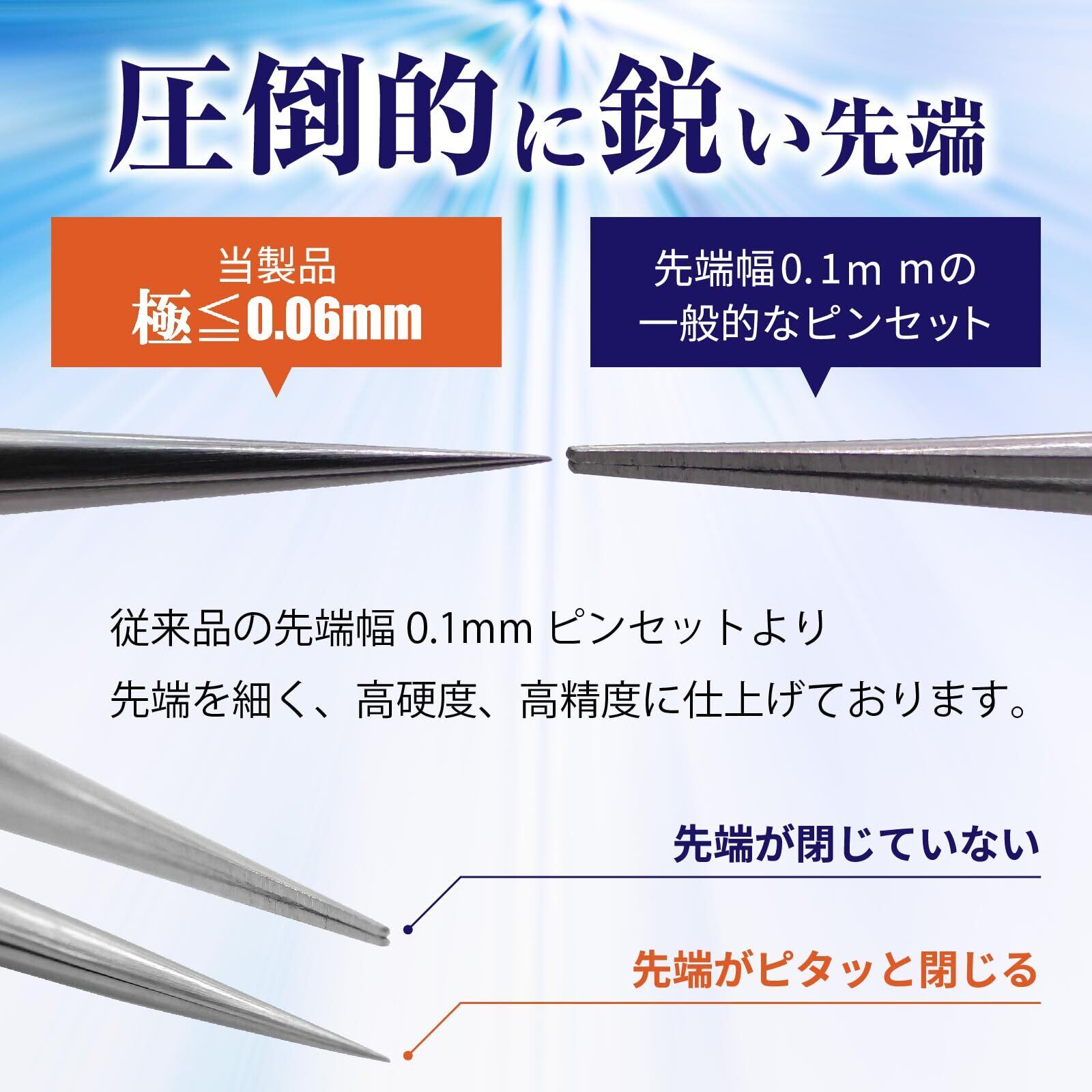 [超高精度] 先端幅≦60µ以下の先端で小さな部品等をしっかり掴めます。精密ピンセットは鋭さにこだわり製品開発をしてきました。他社ピンセットをお持ちならぜひ先端の鋭さを比べていただけたら幸いです。公差±0.02mm
