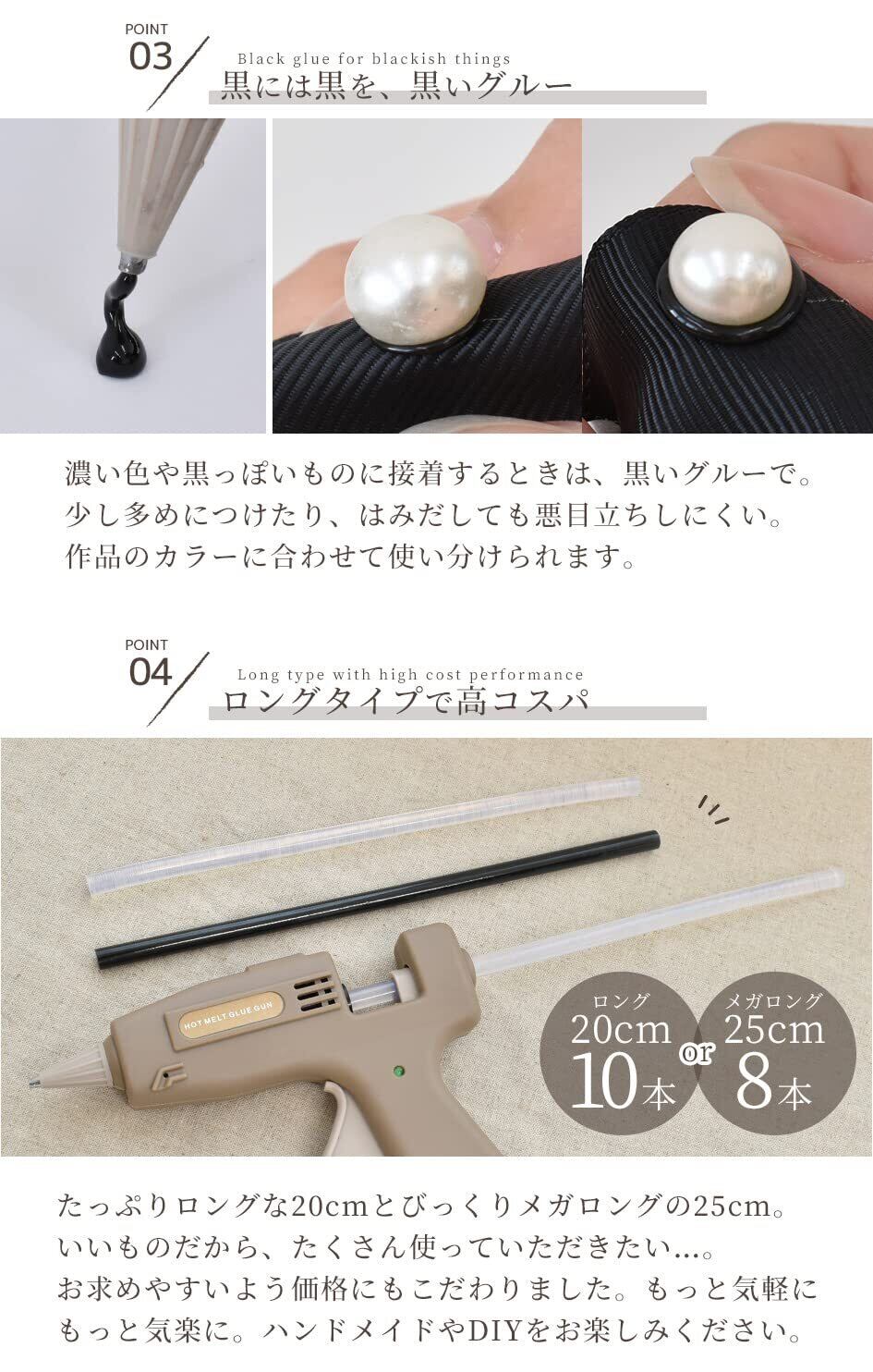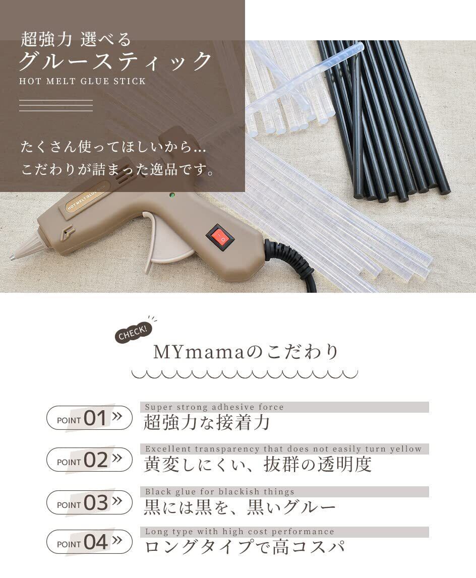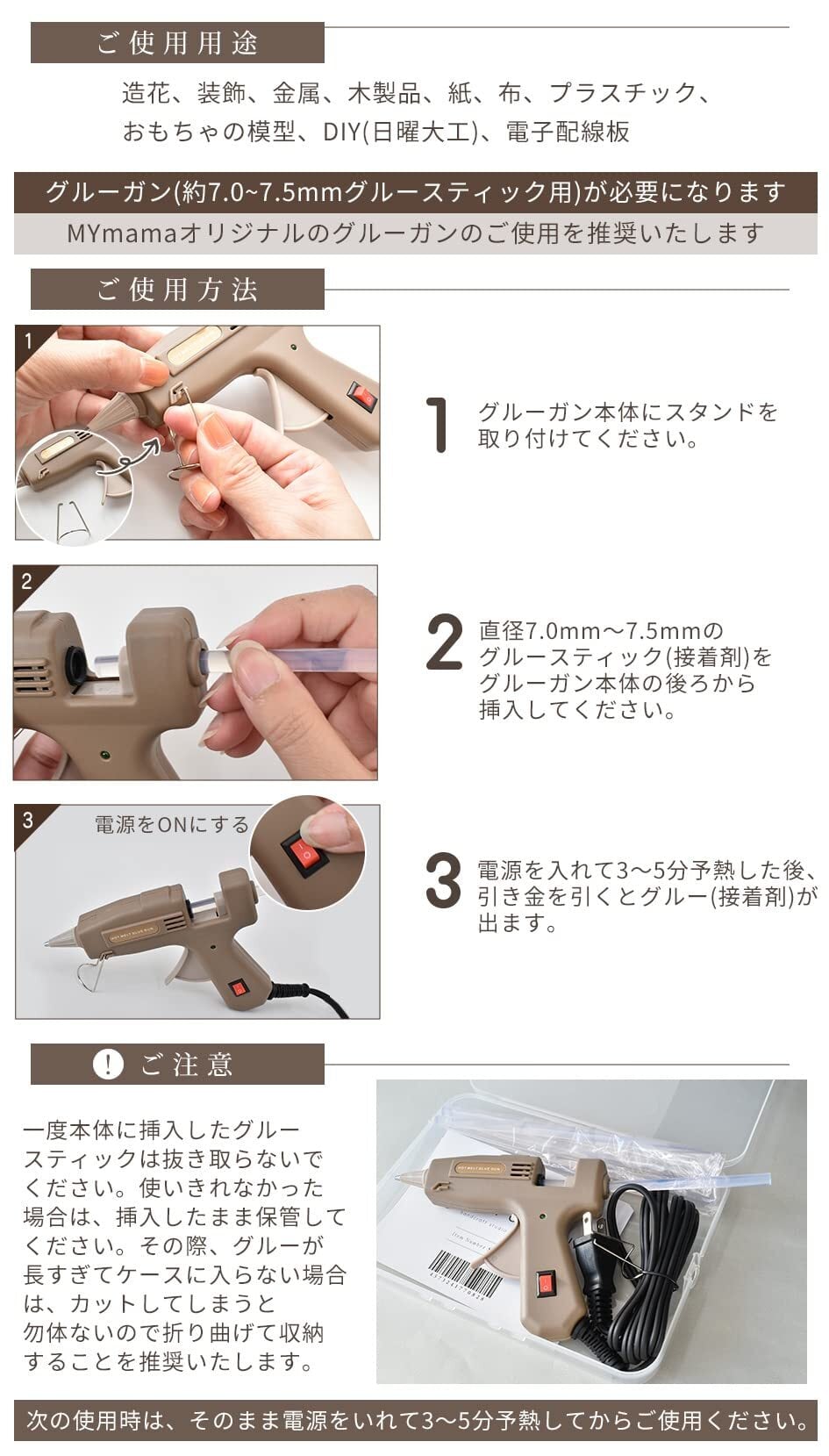 ■ご使用方法:※別売りのMYmamaオリジナル グルーガン(B09MY8LR78)を使用します。別途ご用意下さい。 1,グルーガン本体の後ろから挿入してください 2,電源を入れて3~5分予熱した後、引き金を引くとグルー(接着剤)が出ます ※一度本体に挿入したグルースティックは抜き取らないでください。使いきれなかった場合は、挿入したまま保管して下さい。 次の使用時は、そのまま電源をいれて3~5分予熱してからご使用下さい。