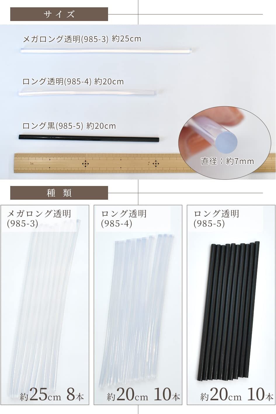 ■商品番号:クリア 25cm 8本(985-3)、クリア 20cm 10本(985-4) 、ブラック 20cm 10本(985-5)