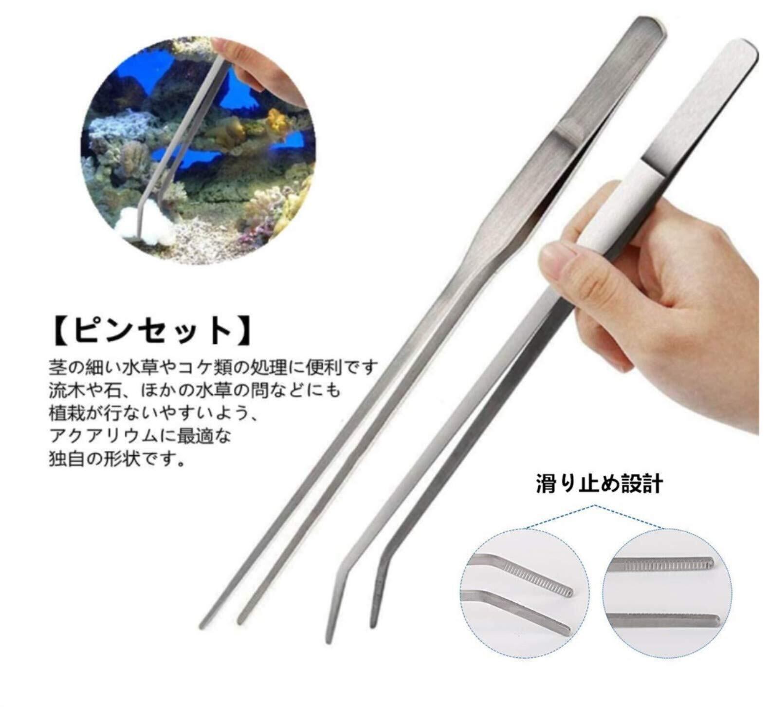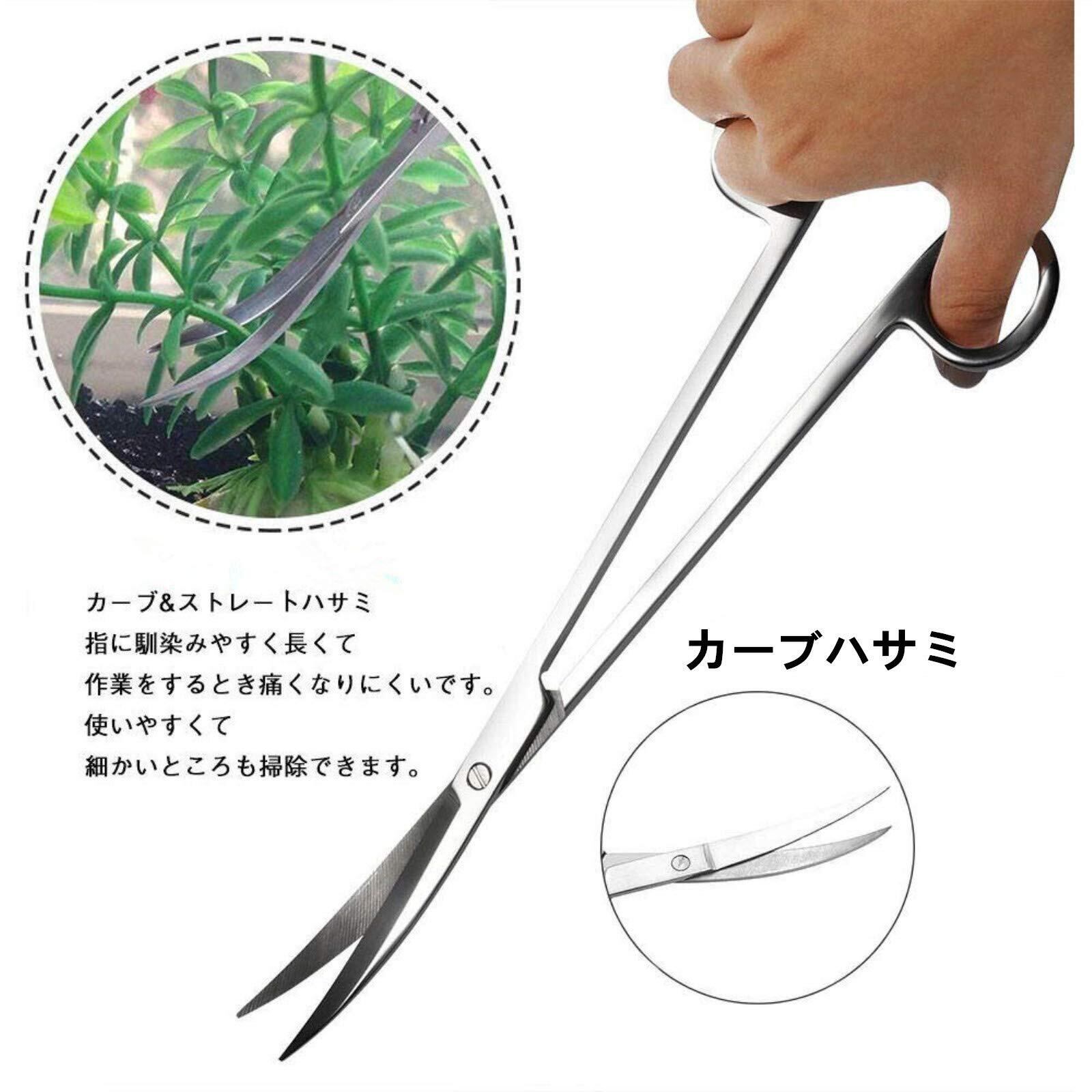 カーブハサミは植栽前の水草の処理や、繁茂した有茎草などにおすすめです。ピンセットは細かくて長くて細かい作業に最適です。滑り止め設計になっており、茎の細い水草やコケ類の処理に便利です。