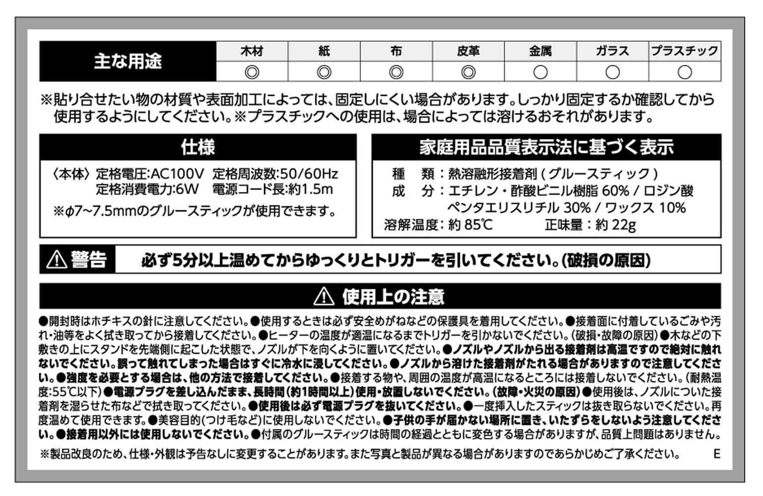 <家庭用品品質表示法に基づく表示>種類:熱溶融形接着剤(グルースティック)、成分:エチレン・酢酸ビニル樹脂60%/ロジン酸ペンタエリスリチル30%/ワックス10%、溶解温度:約85℃、正味量:約22g