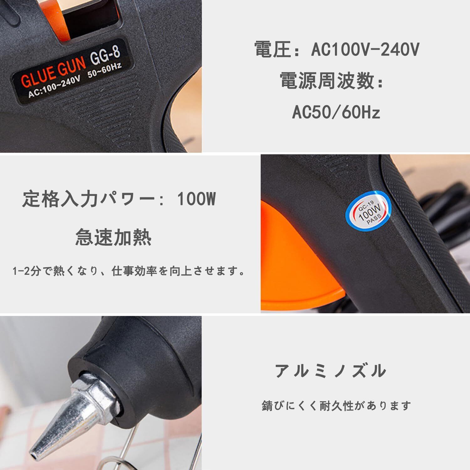 【製品仕様】本体サイズ:約17.7cmx14cm: 接着剤スティックサイズ:197*11mm; 定格入力パワー: 100W; 加熱温度:180℃; 電源コード長さ:約100cm; グルーガンの本体重さ:約195g;適合グルースティックの直径:11mm(+0.3/-0.3mm); パッケージ内容物:グルーガン*1、接着剤スティック*20本。