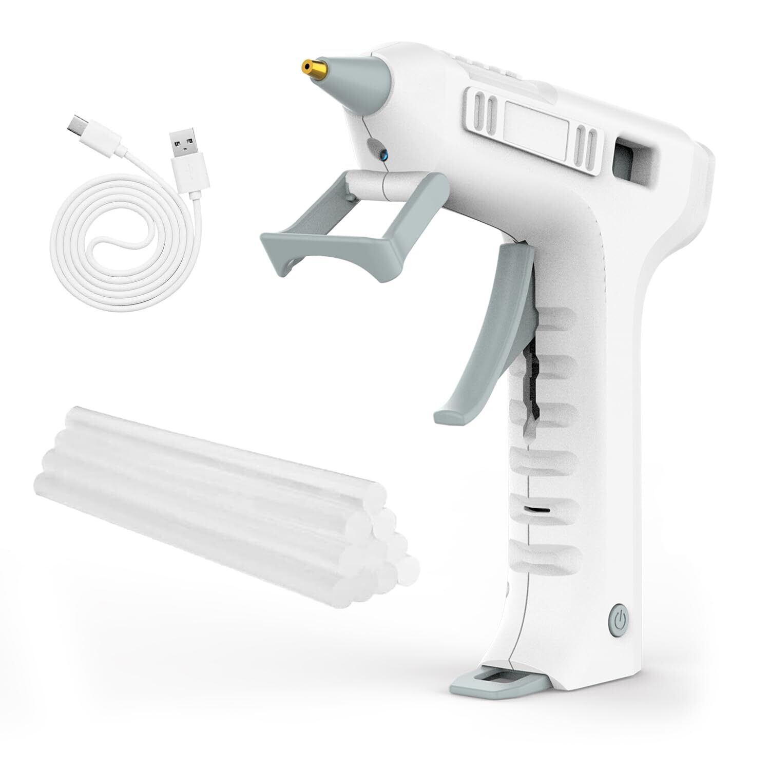【USB充電&安全かつ高速加熱】コードレスグルーガンにはUSBケーブルが装備されており、充電には5V/2A-5V/1Aアダプターを使用できます。 過電流保護機能と過電圧保護機能により、充電時の安全性を確保します。このコードレスグルーガンは最新の加熱技術を使用しており、グルースティックを挿入するだけで、20秒以内に素早くウォームアップします。 10分間の自動電源オフ保護機能が付いているので、誤って電源を入れたままにする心配はありません。 ノズルの保護スリーブは火傷を防ぎ、使用中の接着剤の漏れを防ぎます。