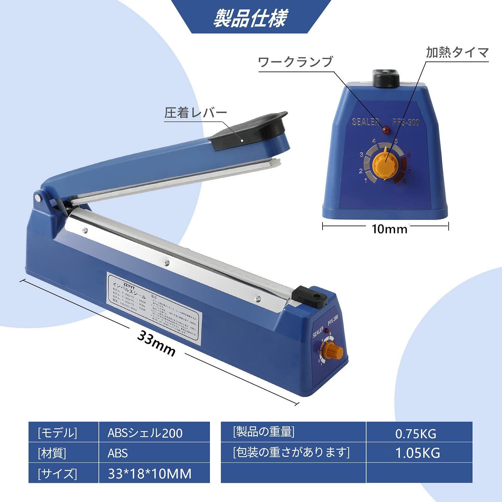 シーラーはプラスチック製で、重量はわずか0.65kg。軽量でコンパクトな本体は、シンプルな外装と人間工学に基づいた設計で使いやすさ抜群です。製品サイズは304×77×120mmで、さまざまなシーンに対応可能です。