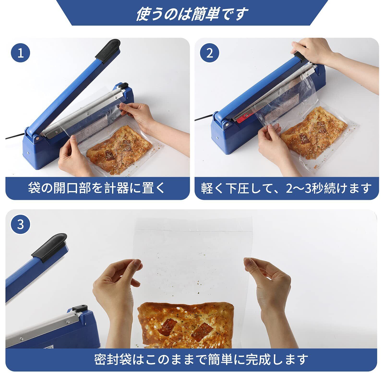 シーラーの標準シールサイズは200×3mmです。さらに、異なるサイズの加熱ワイヤーを3本付属しています。包装のカットが可能な丸型ワイヤー1本と、幅が2cmと3cmの加熱ワイヤーが含まれており、さまざまな包装ニーズに柔軟に対応できます。