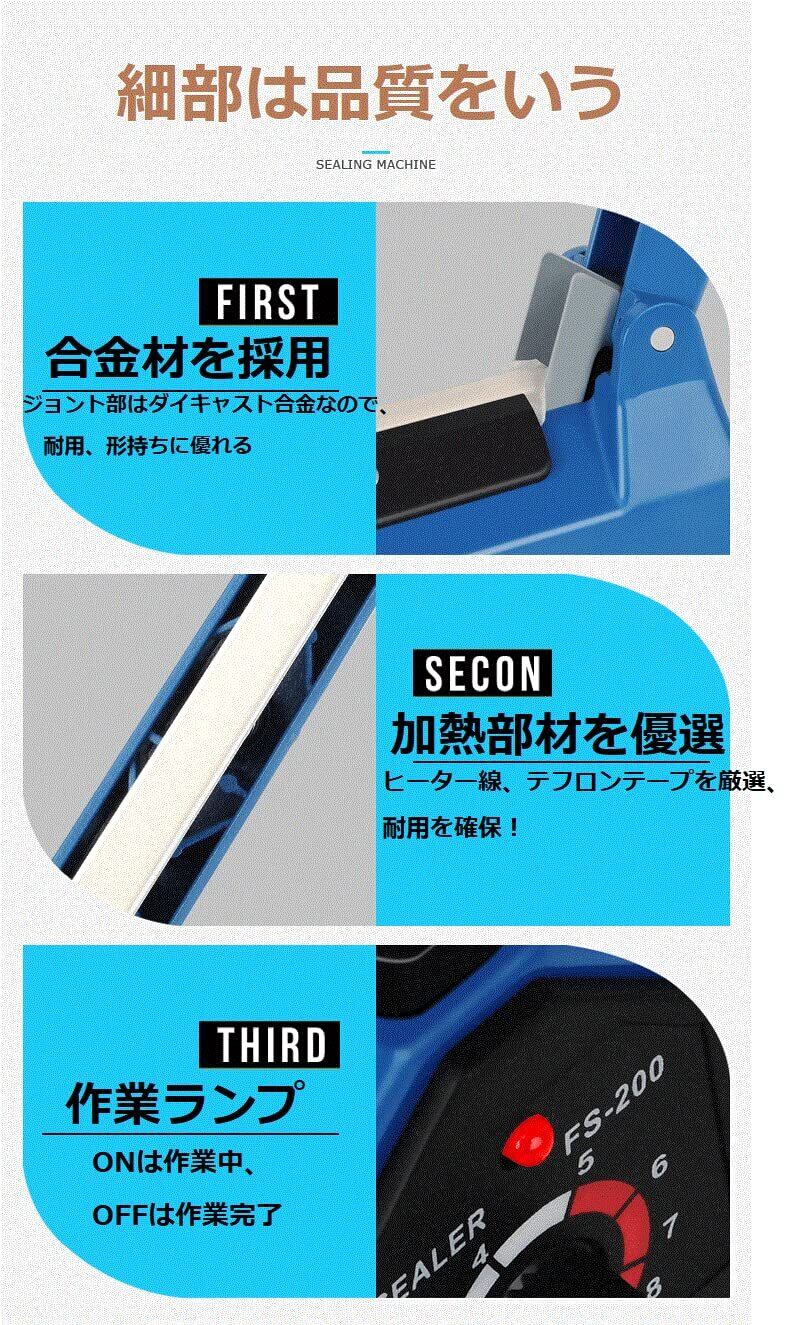 溶着タイプで、シール幅200mm、300mm、400mm、シール巾0.6mmで、袋の厚み0.6mmまで対応可能です 。