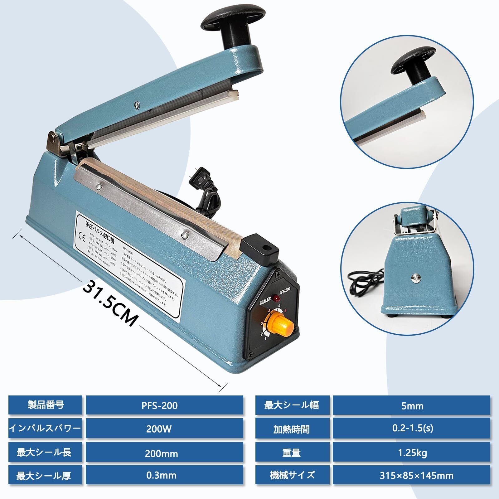 【製品仕様パラメータ】機械サイズ: 315×85×145mm、最大シール長:200MM、シール幅:5MM、材質:金属鉄シェル、カラー:ブルー、重量:1.25kg、梱包内容:インパルスシーラー×1、予備電熱線キット×2、取扱説明書×1。パルス原理でシール溶接を行うパルスシール機で、電源を差し込んだ直後に使用できます。 家庭用シーリングマシンとして、金属シェルはより安全で安定しており