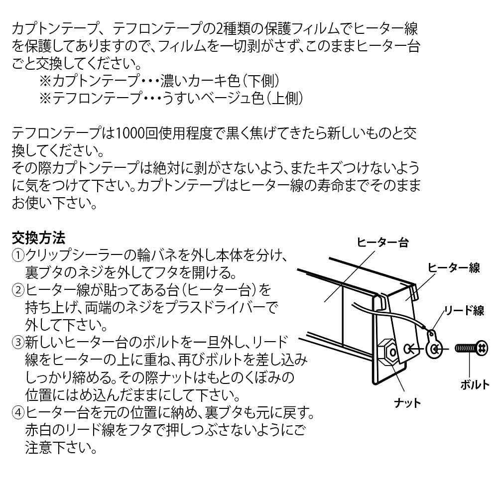 ・クリップシーラーZ-1専用の用ヒーターです。 ・ドライバーがあれば、ご自分で簡単にできます。 ・このヒーターは、通常使用で5000回程度使用出来ます。 ・ヒーター線、テフロンテープ、カプトンテープなど全てセット済みです。