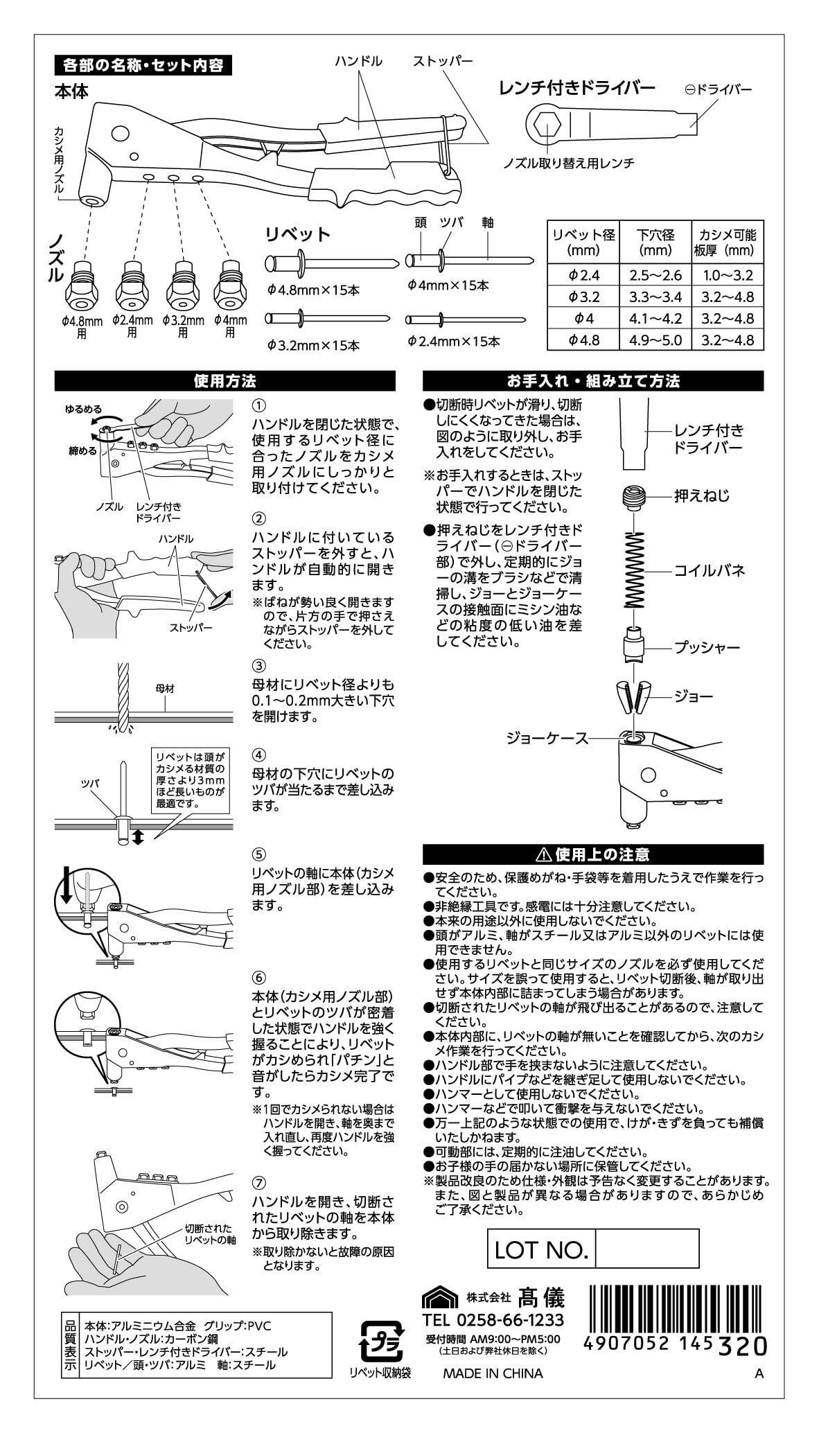 セット内容:本体、ノズルΦ4.8/4/3.2/2.4mm用、レンチ付きドライバー(ノズル取替用)、リベットΦ4.8mm/Ф4mm/Ф3.2mm/Ф2.4mm各15本付