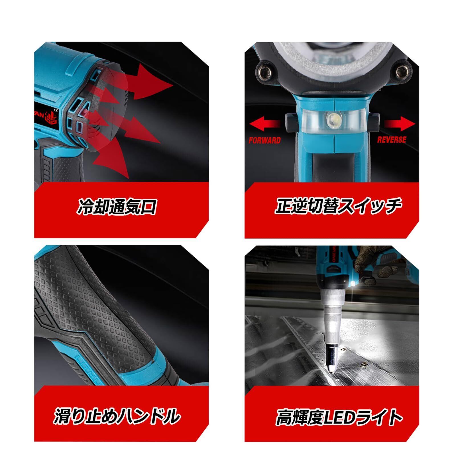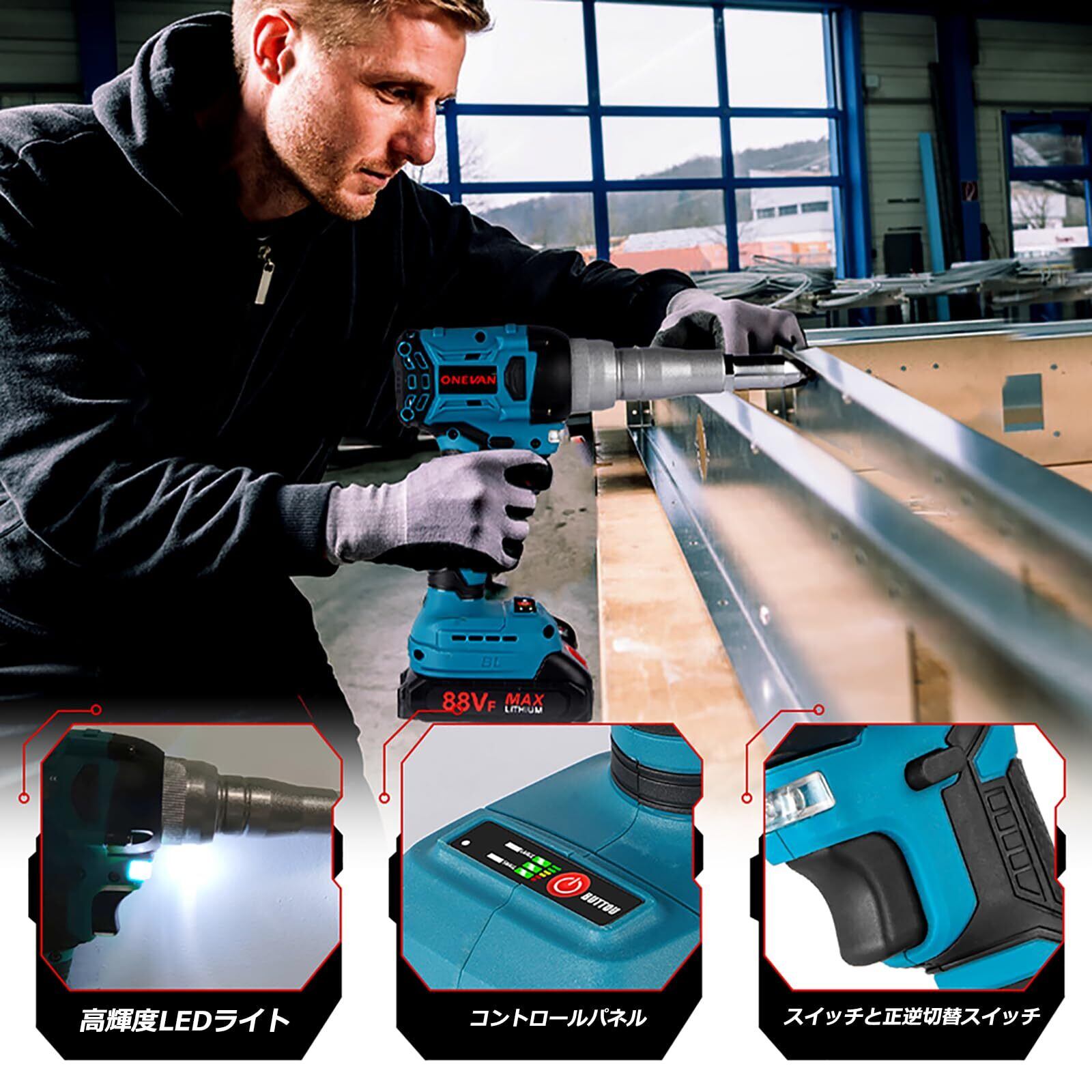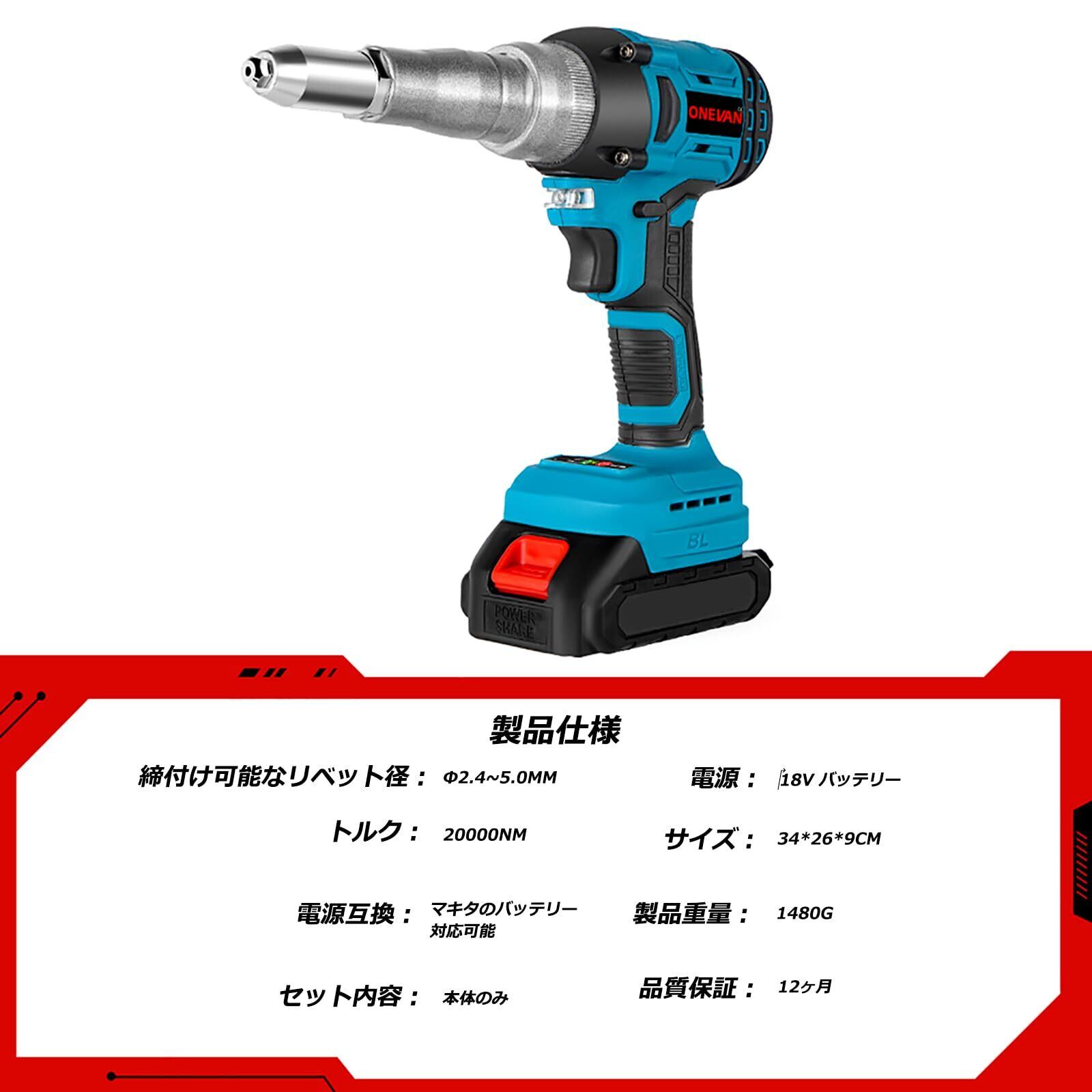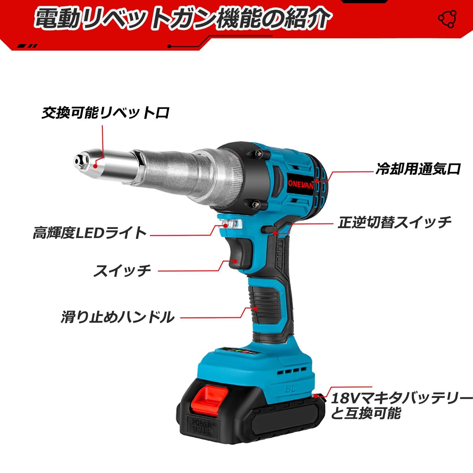 ONEVAN ハンドリベッター 充電式 電動リベットガン 2.4~5.0mm 18V マキタの18Vバッテリー互換可能 軽量 ハンドナッター リベット 工具 1年間(本体だけ)