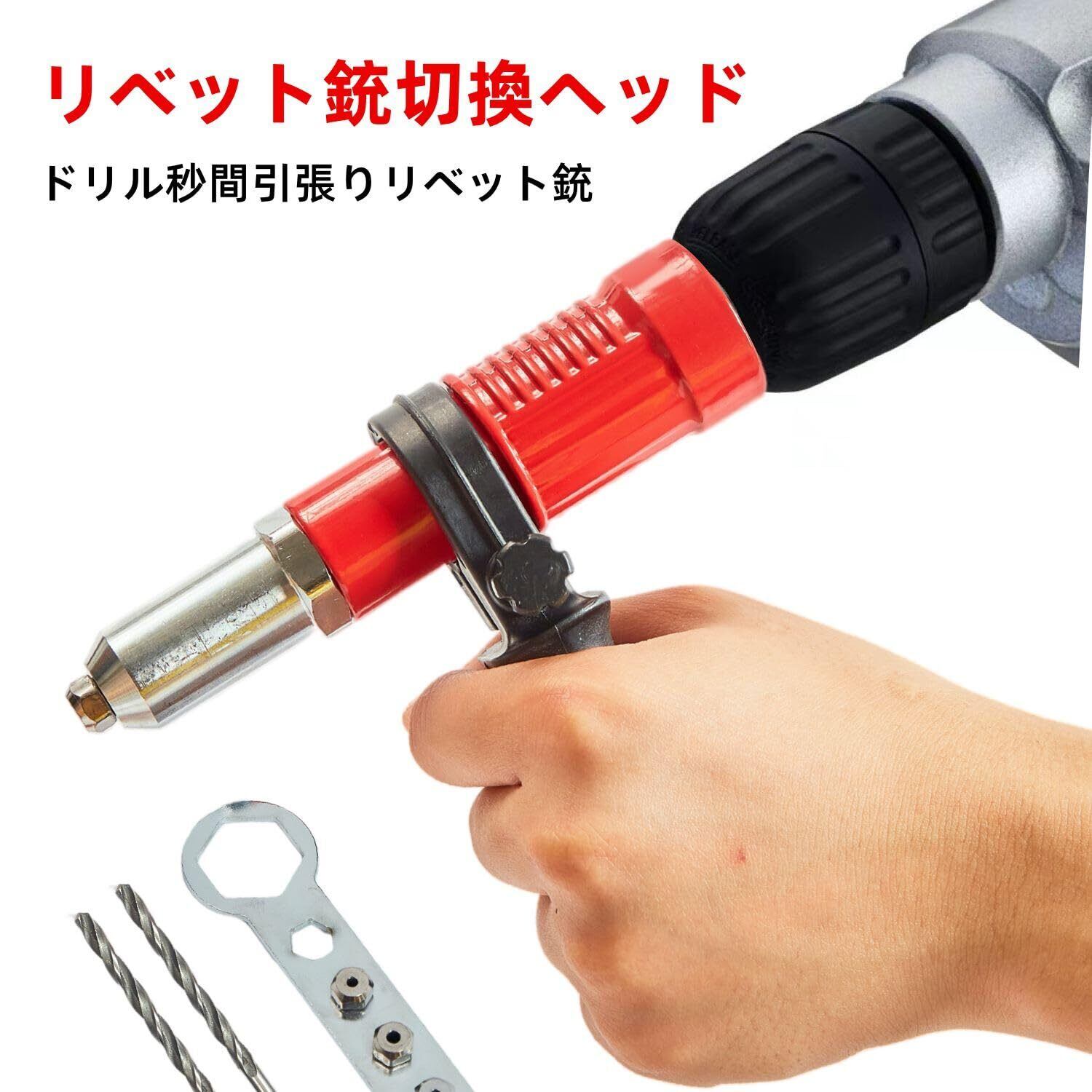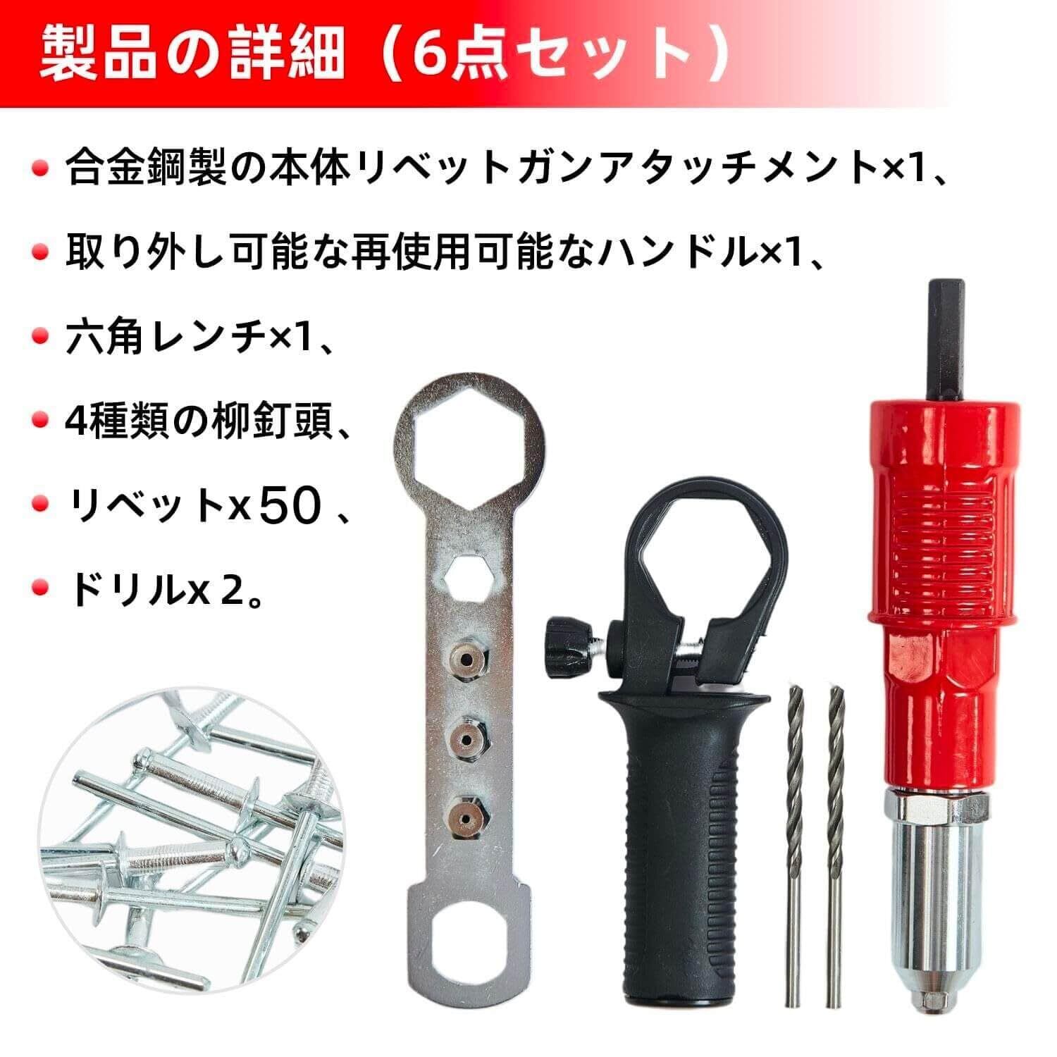【組み込み内容】合金鋼製の本体リベットガンアタッチメント×1、取り外し可能な再使用可能なハンドル×1、六角レンチ×1、4種類の柳釘頭、リベットx 50、ドリルx 2。
