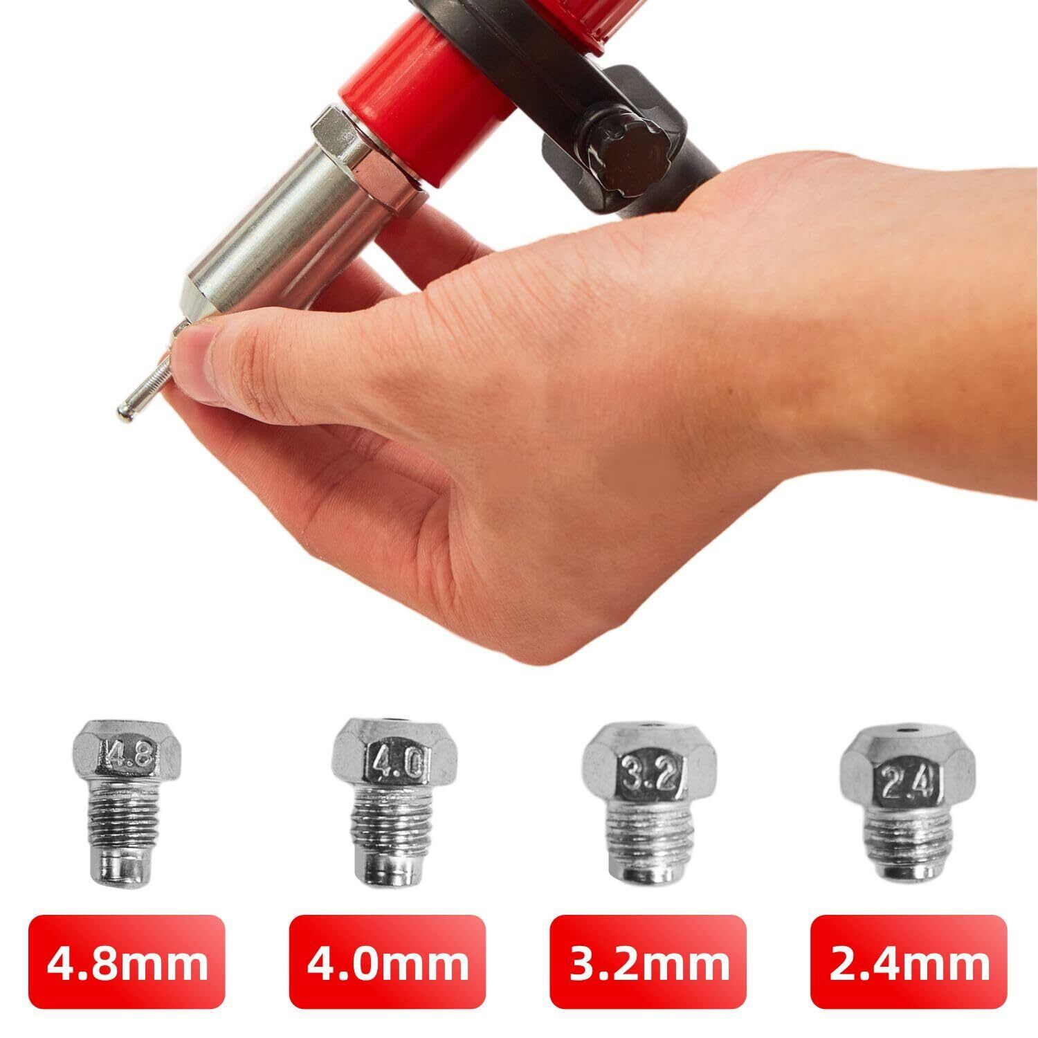 【対応】一つのツールで4つのサイズのリベットに対応:2.4mm/3.2mm/4.0mm/4.8mm。多様な作業環境と要件に適応できます。