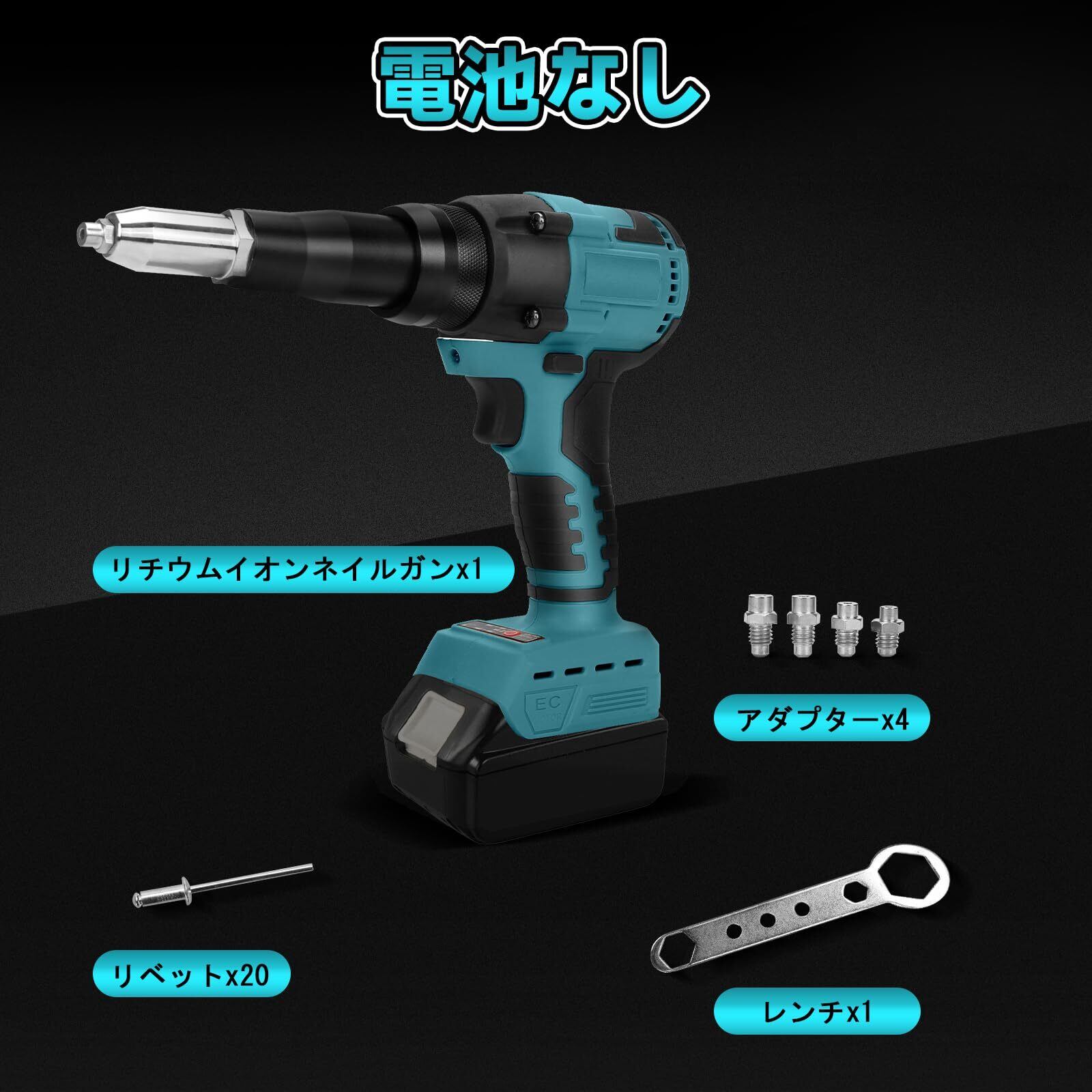 【幅広く使用&1年間の付き】bumxca 電動リベッターは、コードレス設計により、作業場所を選ばず自由に使用可能。φ3/16インチ(4.8MM)、φ5/32インチ(4.0MM)、φ1/8インチ(3.2MM)の3種類のアダプターを同梱しており、様々なサイズのリベットに対応します。重量わずか1.1kgの軽量ボディと人間工学に基づいたグリップ設計で、長時間の作業でも手の疲れを軽減。自動車整備、工業製品の組立、建築工事など、多様な現場で活躍します。付属のリベット20本ですぐに作業を開始できるのも便利なポイントです。【100%満足】1年間のメーカー!お客様に100%の満足を提供するよう努めています。ご満足まで対応致しますので、是非改善。ご使用中に品質上の問題が発生した場合は、「アカウントサービス」→「注文記録」→「販売者」→「質問」を通じてご連絡いただければ、対応させていただきます。