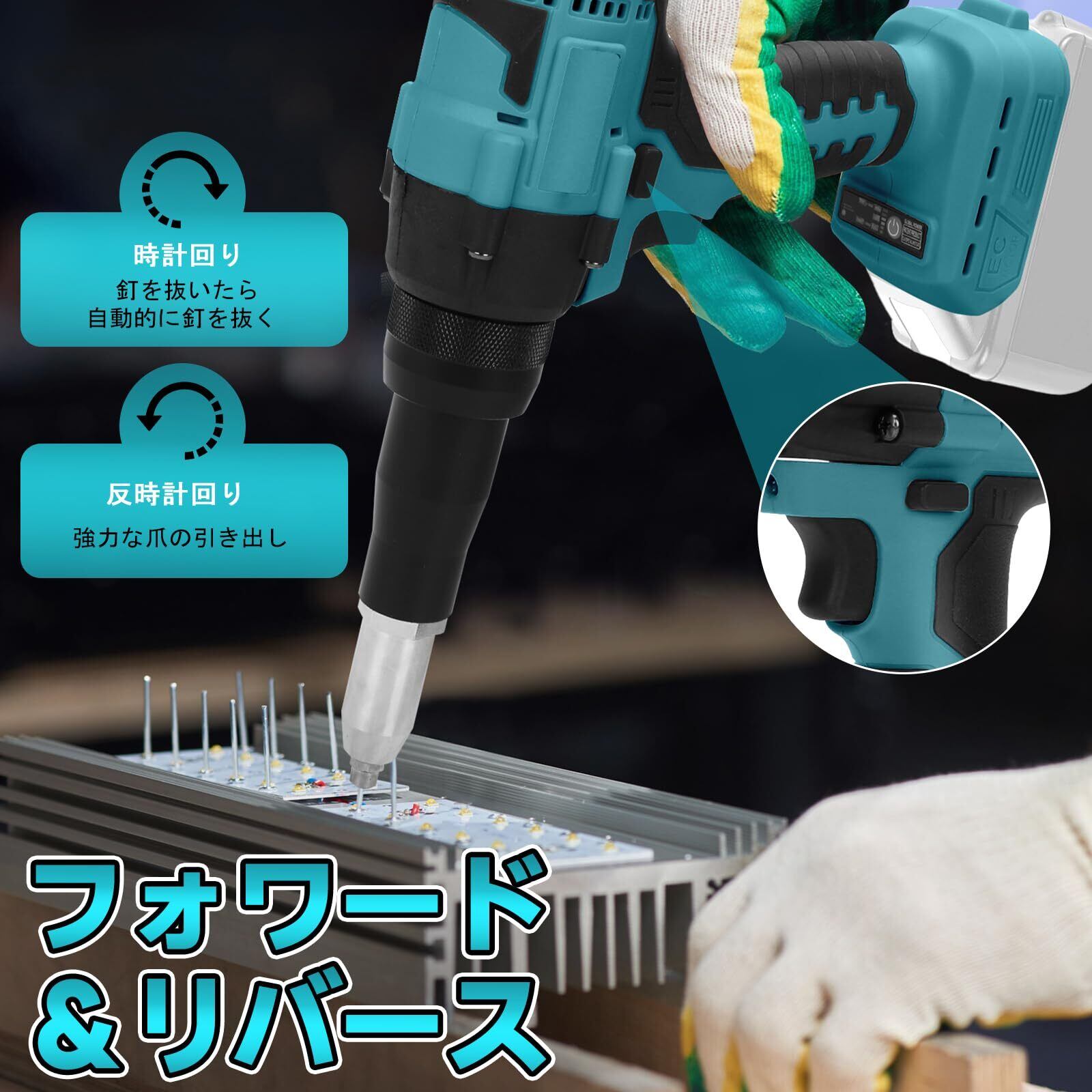 bumxca リベッター 電動リベッター マキタ18Vバッテリー対応 ブラシレスモーター ハンドリベッター LEDライト搭載 リベット 工具 3.2MM~4.8MM 正逆転切替可能 無段変速スイッチ 保護機能 コードレス 低騒音 リベット20本付き 電動工具 強力 片手 軽量 長時間作業可能 【本体のみ バッテリー別売り】 1年間メーカー | KSショップ