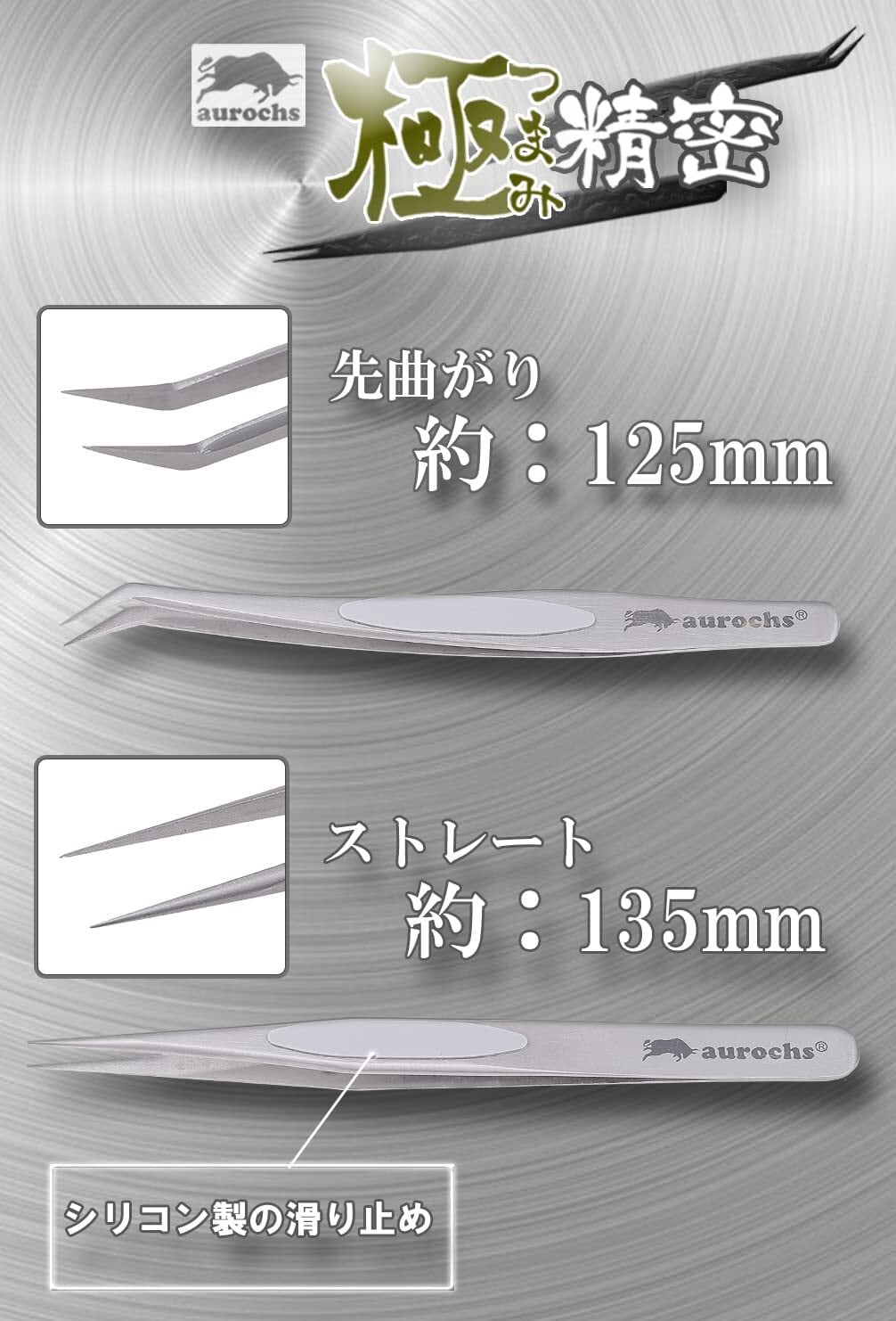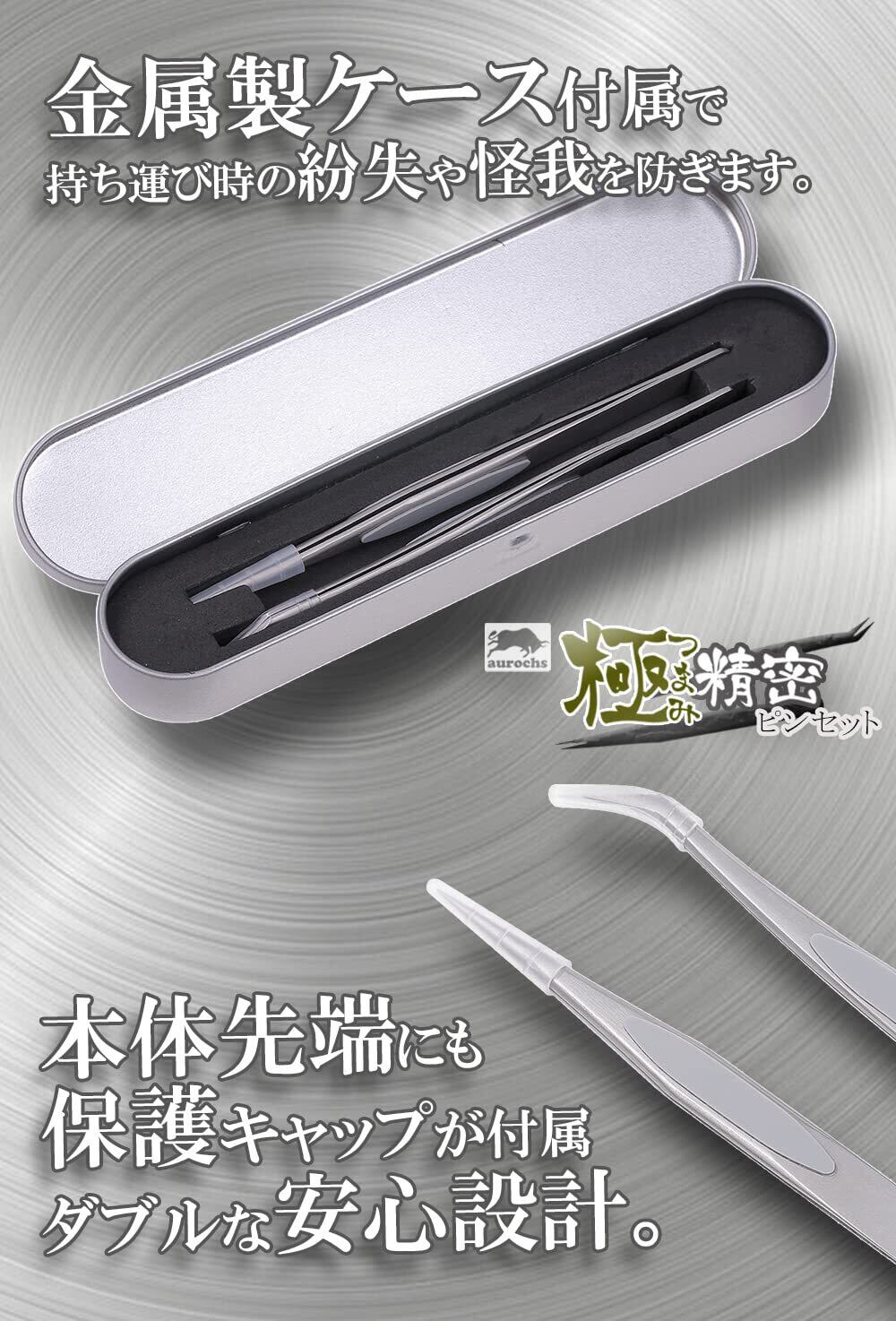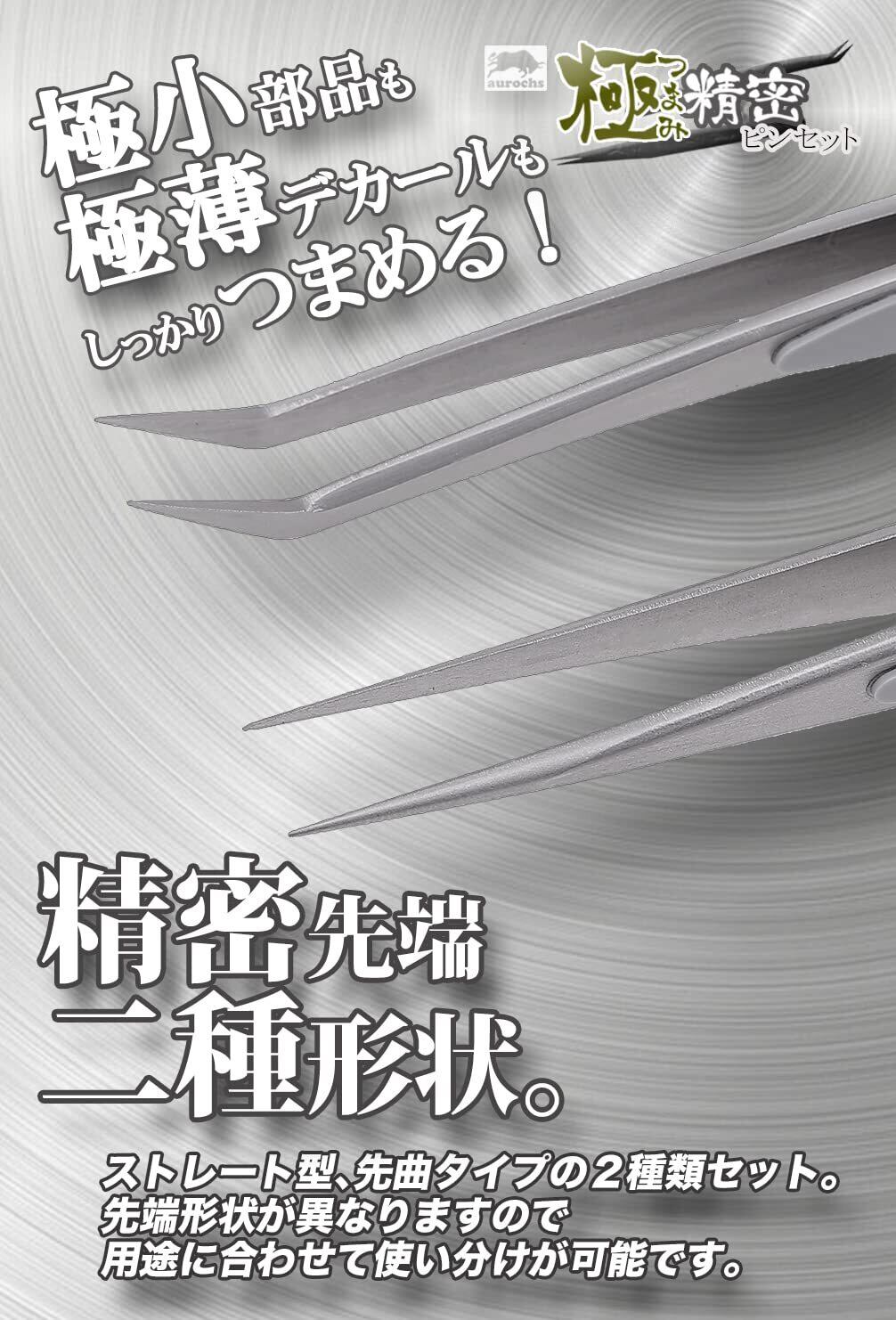 aurochs 極ツマミ 精密 ステンレス ピンセット ストレート 先曲がり 2本セット ケース付