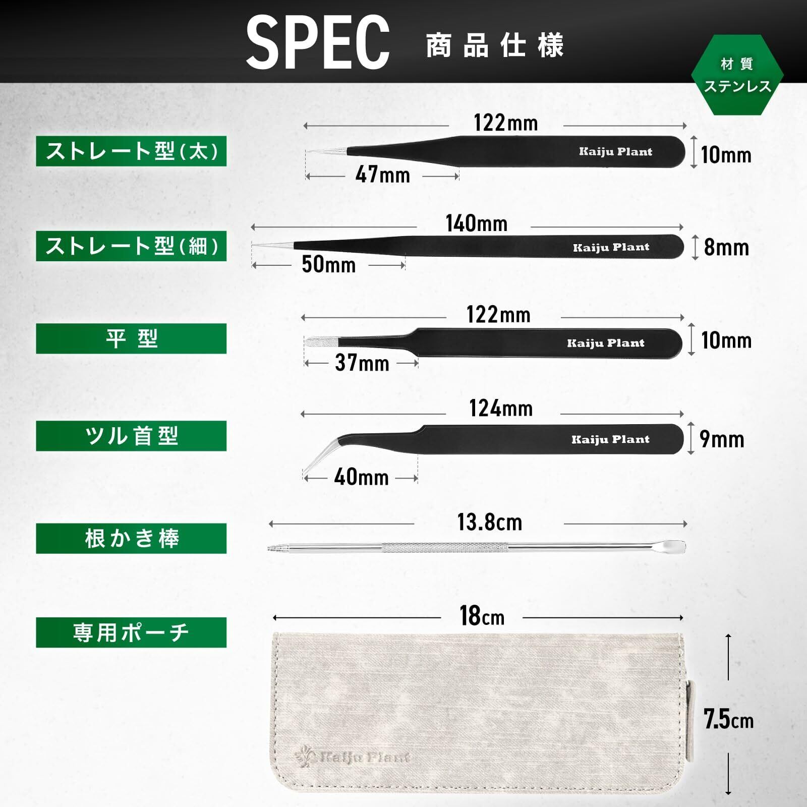 Kaiju Plant ピンセット 4種 + 根かき棒 植替え 美しく仕上げる 多肉 アガベ サボテン 園芸 DIY ポーチ付き ステンレス