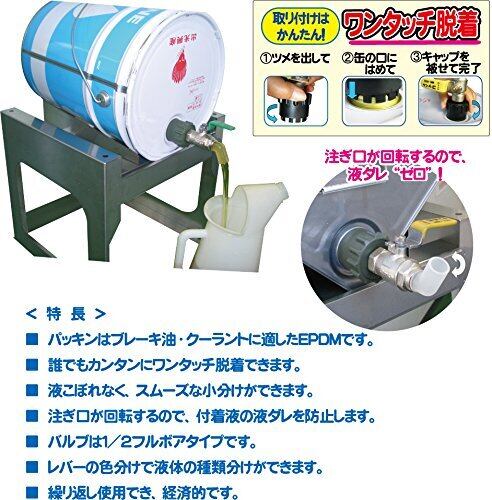 ●誰でも簡単にワンタッチ脱着できます。●油こぼれなくスムーズな給油ができます。●可動エルボ付で、レバー閉栓後の付着油の液ダレがありません。●コックレバーの色分けで油の種類分けができます。●バルブは1/2のフルボアです。