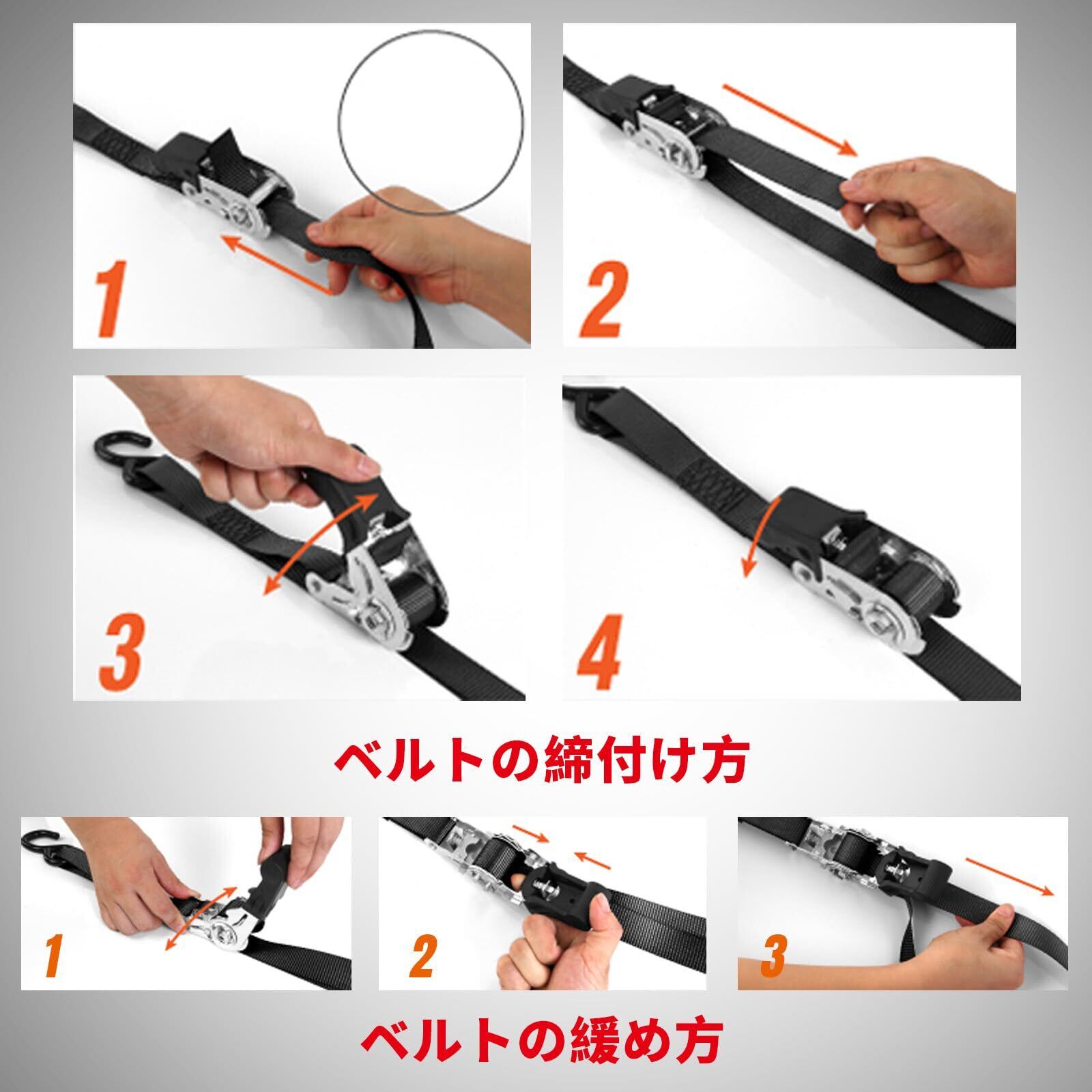 【簡単操作】ベルトの締付け方:ハンドルが水平でない状態で、手に優しいゴムハンドルを反復させて徐々に締まります。ベルトの緩め方:白いゴムの位置を押さえて、グリップを水平に調整して、ベルトを引き出せばいい