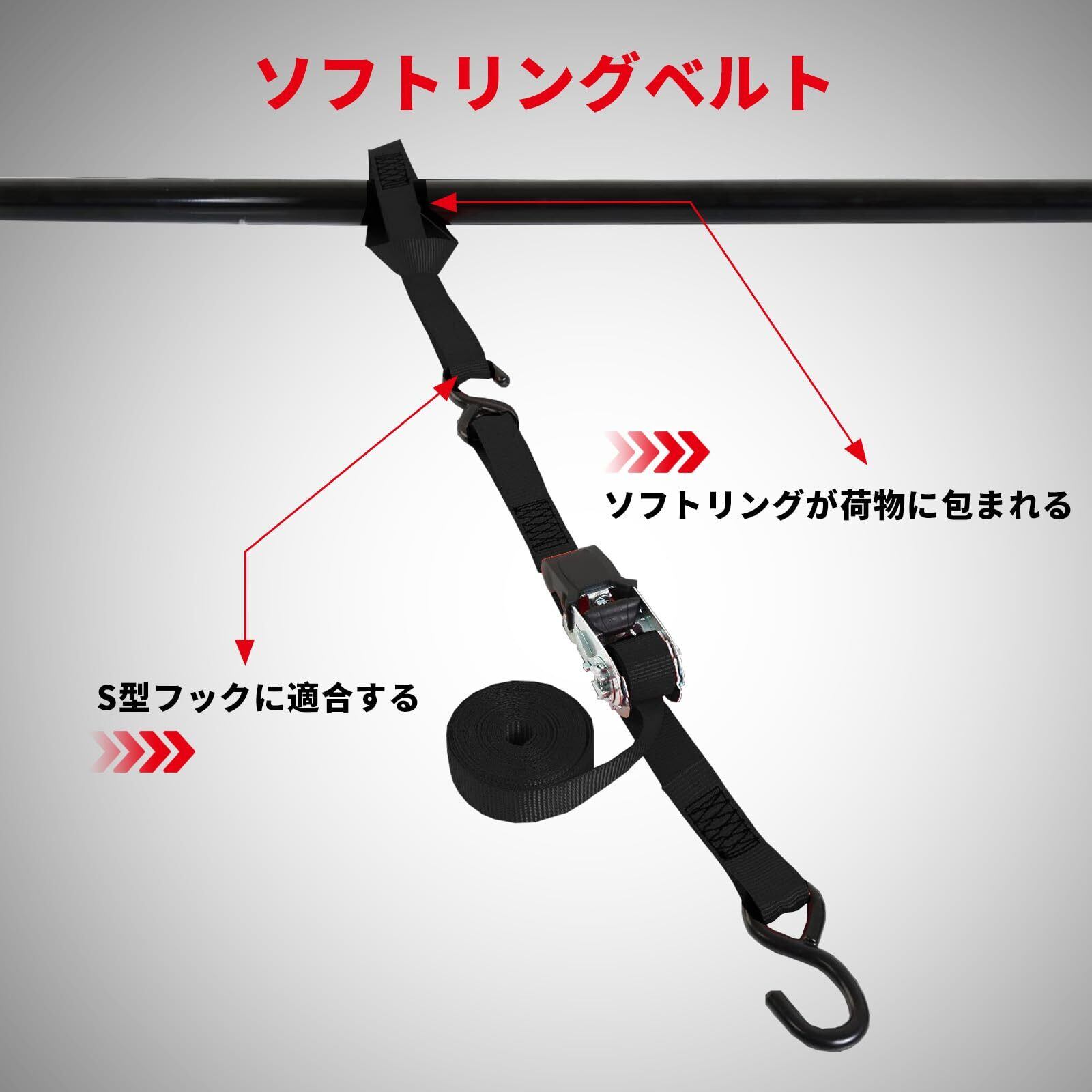 【商品仕様】長さ:4.5m、幅:2.5cm、重さ:2kg、セット:4本。破断強度:680kg、最大使用荷重:225kg