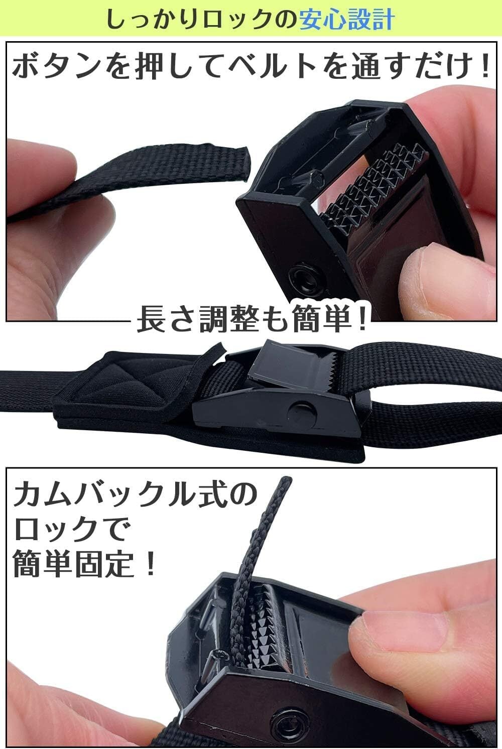 【簡単操作のカムバックル式】 力の弱い方や女性でも使いやすいカムバックル構造。ボタンを押して通すだけで着脱スムーズ。※バックル下側(パッド側)から通してください。バックル上側(ボタンのある方)からベルトを通すとベルトが緩んでしまいますので間違えないようにご注意ください。