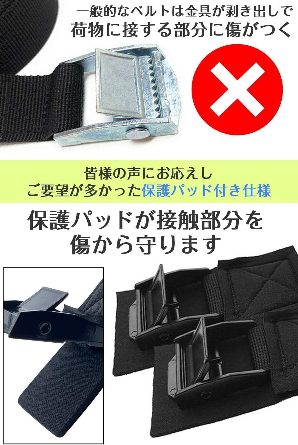 【荷物を傷つけない安心設計】 金具部分に柔らかい保護パッドを装備し、荷物との接触で生じる傷を防止。バイクや車のルーフキャリアにも安心して使える設計です。