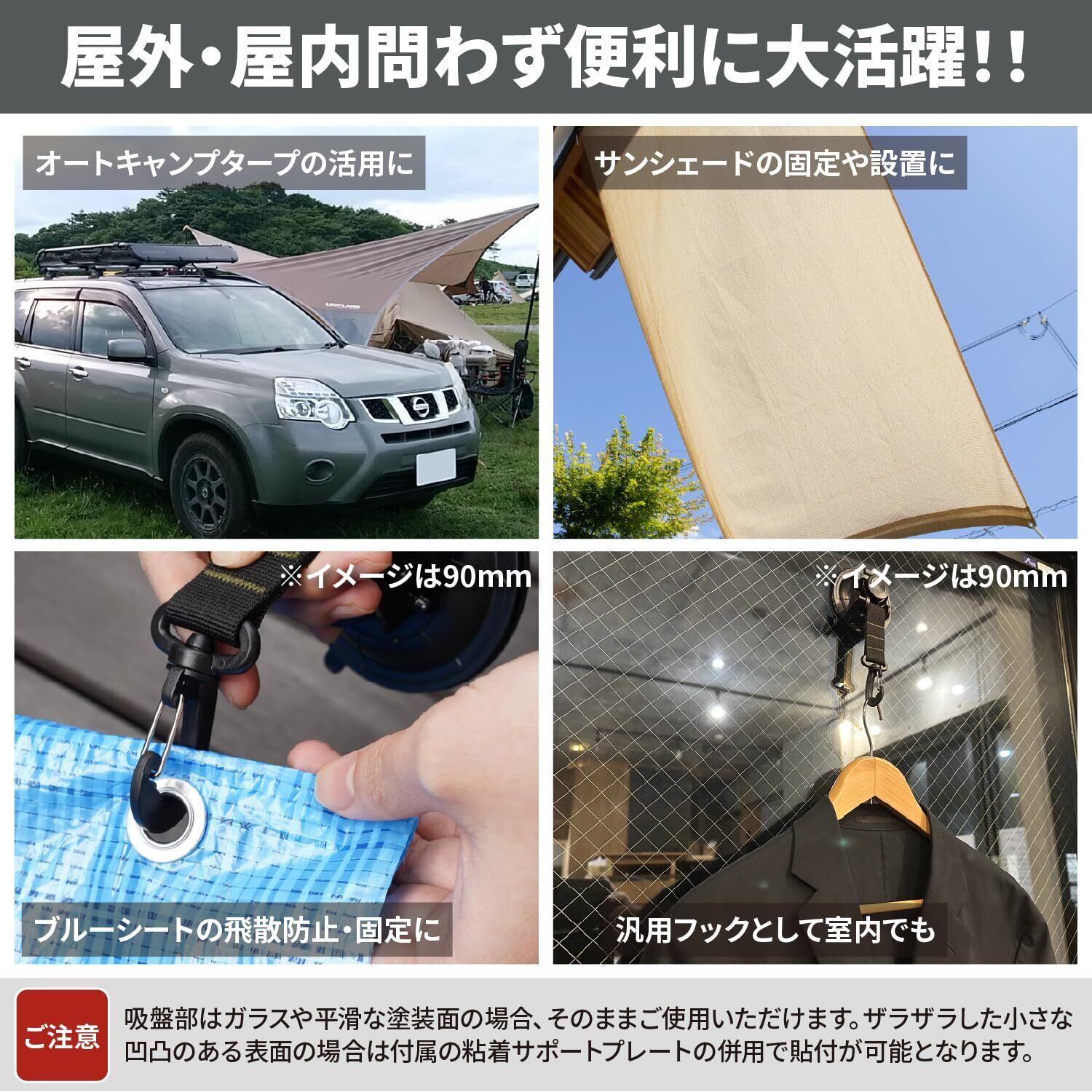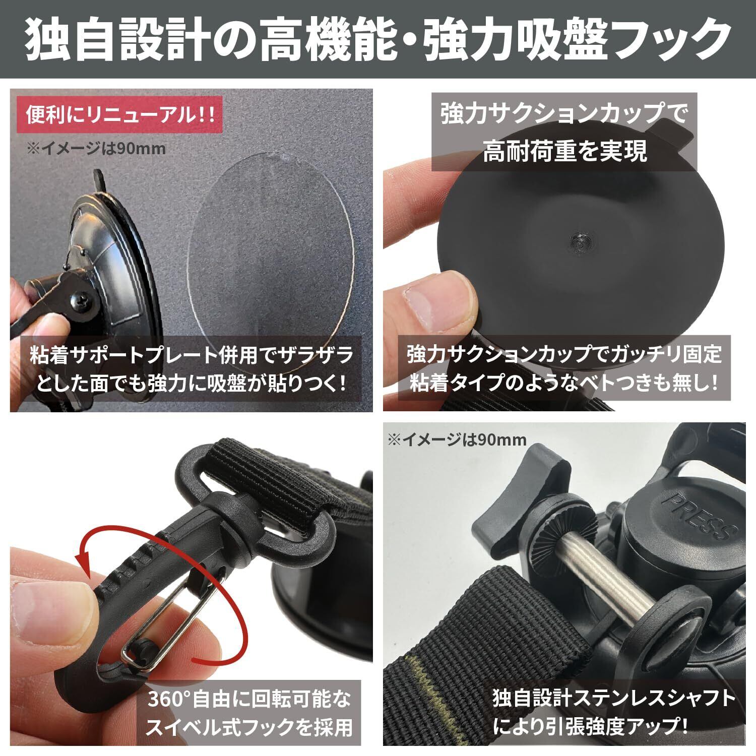 【商品詳細】 耐荷重を強化した大型の90mm仕様とコンパクトで扱いやすい小型の65mm仕様の2タイプ。(吸盤部直径) また太いストラップの取り付けや、手軽に脱着が可能なエンジニアリングプラスチック製のカラビナ(着脱可能)も付属。 シンプルかつ機能的なデザインを採用し、ストラップを補強するアクセントカラーの刺繍入り。