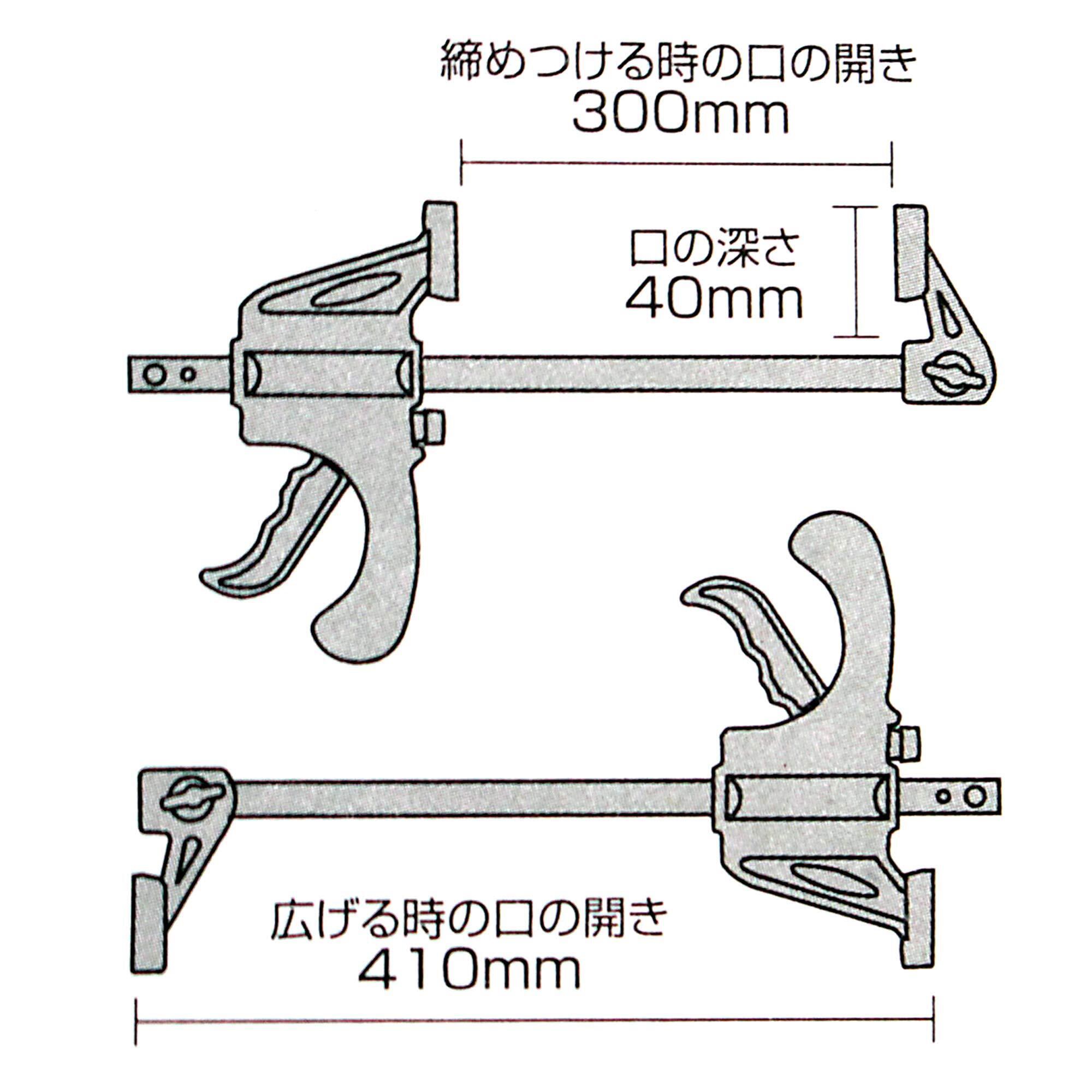 締め付けるときの口の開きは約300mm広げるときの口の開きは約410mm、口の深さは約40mmです。