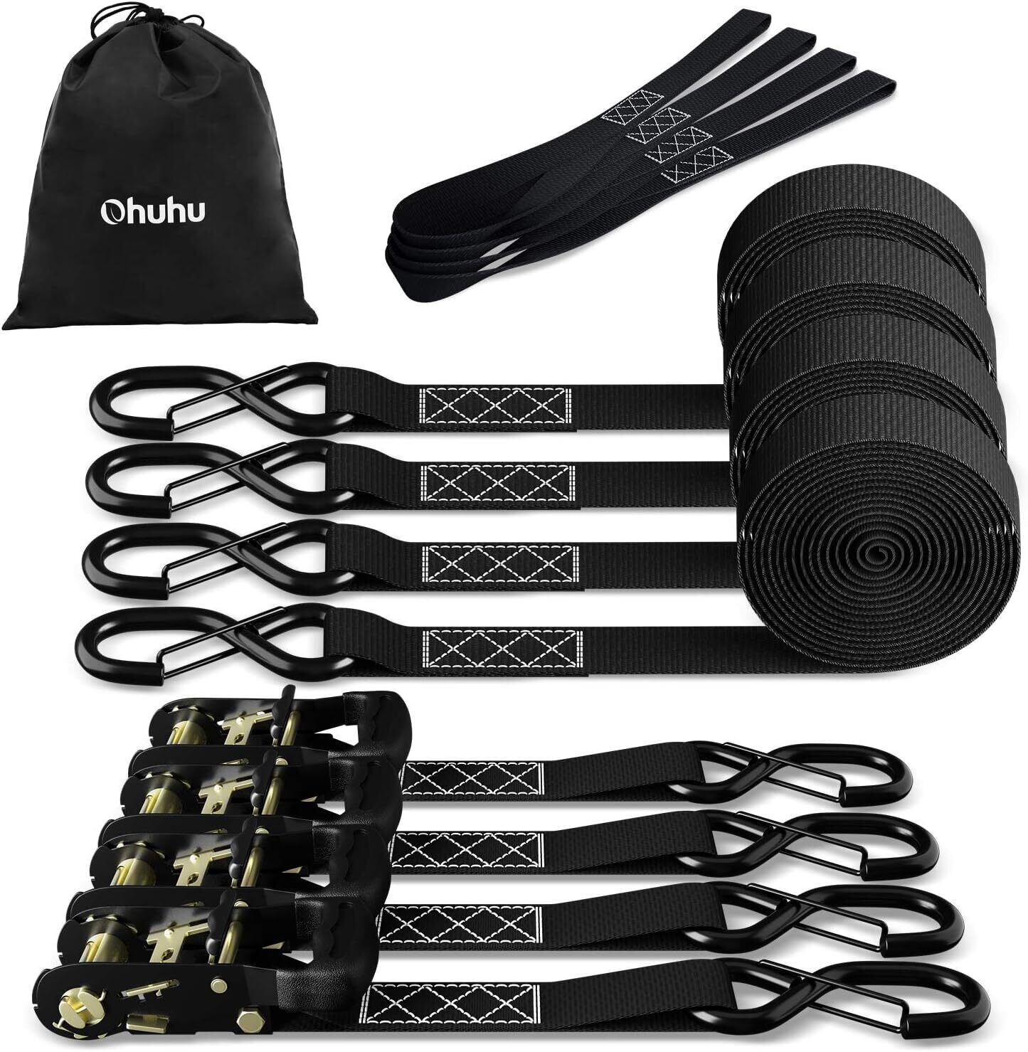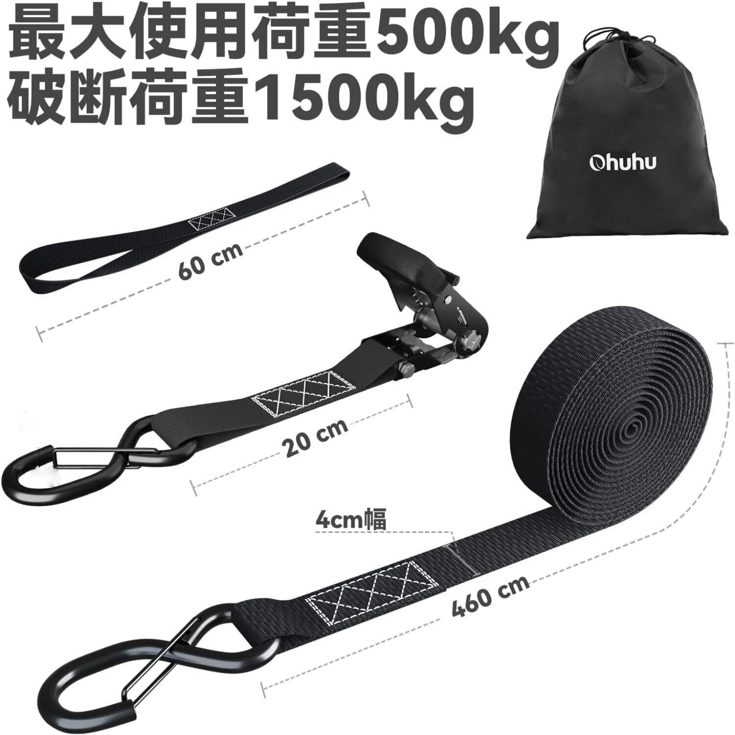 Ohuhu ラッシングベルト ラチェットベルト タイダウンベルト 4.6m 幅38mm 破断荷重1500kg マックス使用荷重500kg 荷物固定 ベルト ラチェット式 締付固定 引越し 運搬用 多用途 ブラック(4本セット)