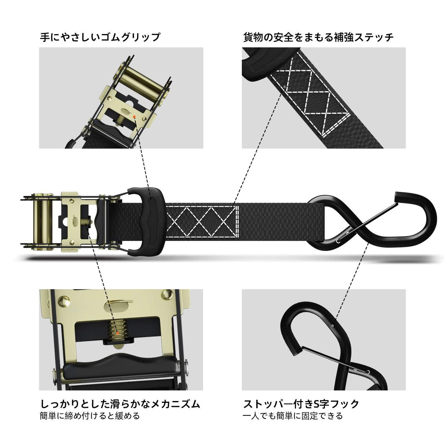 【幅広い用途の荷締めベルト】:DIY、キャンプ、アウトドアの荷物の運搬・固定・結束、荷崩れ防止、運送、運搬、倉庫、港湾作業など様々なシーンで大活躍。