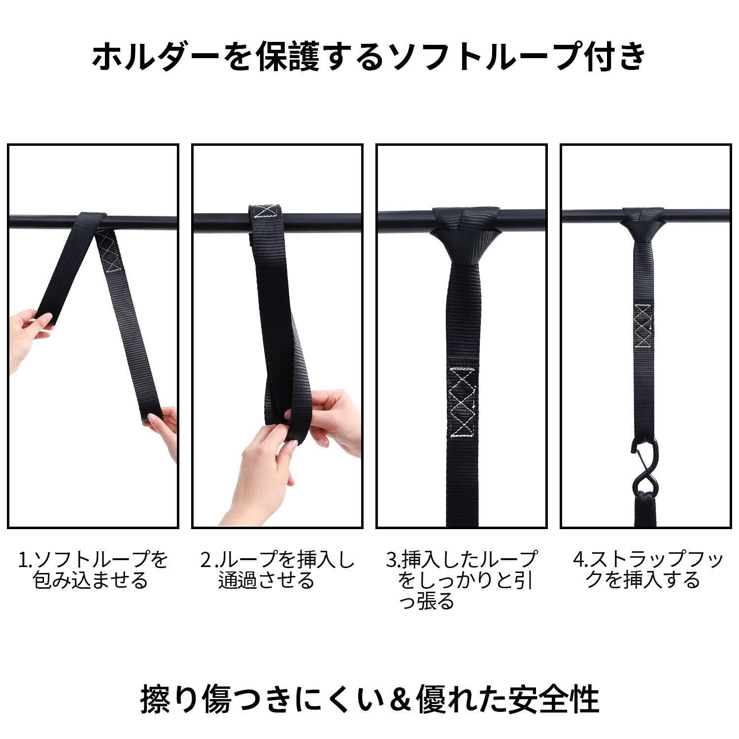 【ストッパー付きS字フック】:外しにくいストッパー付きS字フックにはコーティングされ、耐摩耗性のナイロンソフトループにより、ホルダーと荷物を擦り傷から守ります。