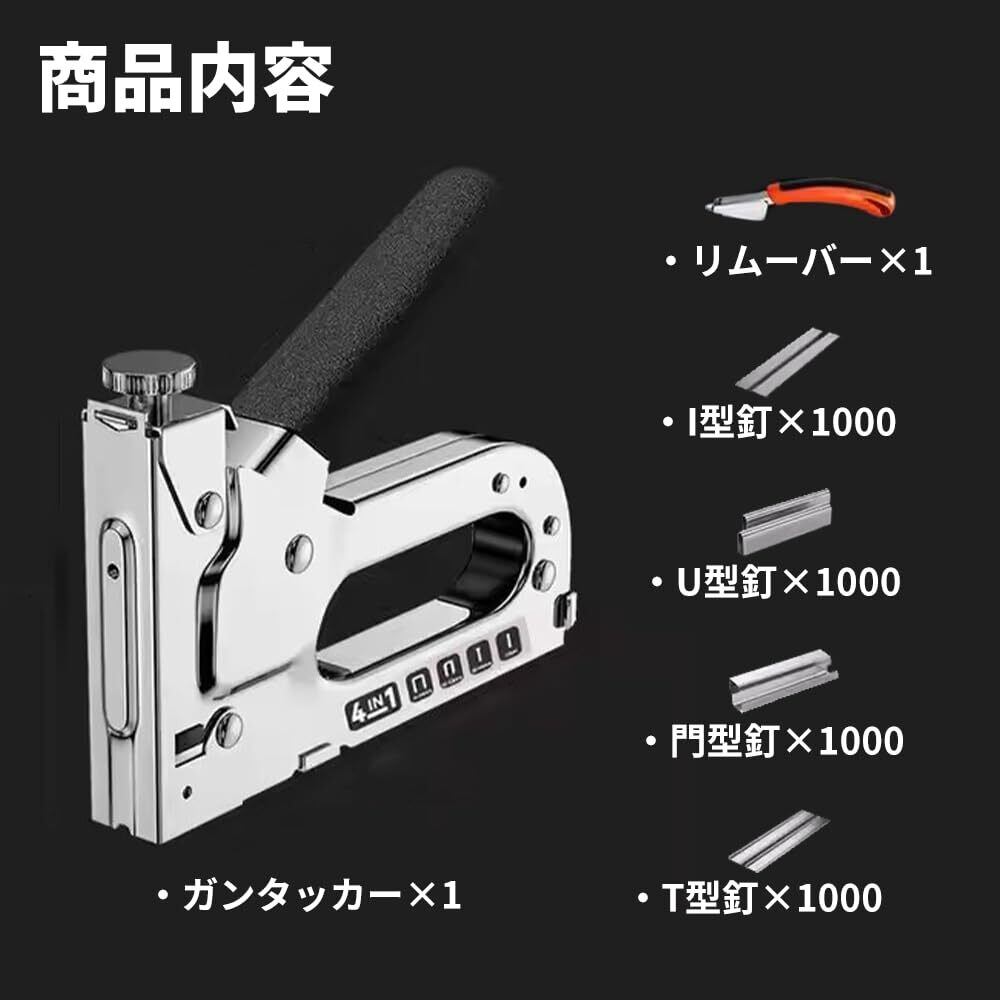 【すぐに使える充実セット】ガンタッカー本体に加えて、4種の針(I型・U型・門型・T型)を各1000本ずつ、さらにリムーバーも付属。開封後すぐに使えるセット内容で、DIYやリフォーム作業にピッタリです。