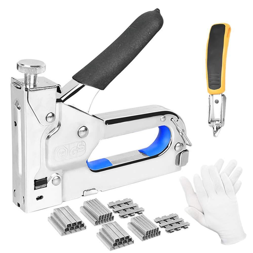 【三種類替針対応】T型(10-14mm)・U型(10-12mm)・コ型(4-14mm)の替針対応可能。ステープルガン本体サイズ:幅15.5×高さ11.5×厚さ2.4cm、セット内容:ガンタッカー*1、ステープルリムーバー*1、手袋*1、ステープル(コ型・U型・T型)・各1000枚。
