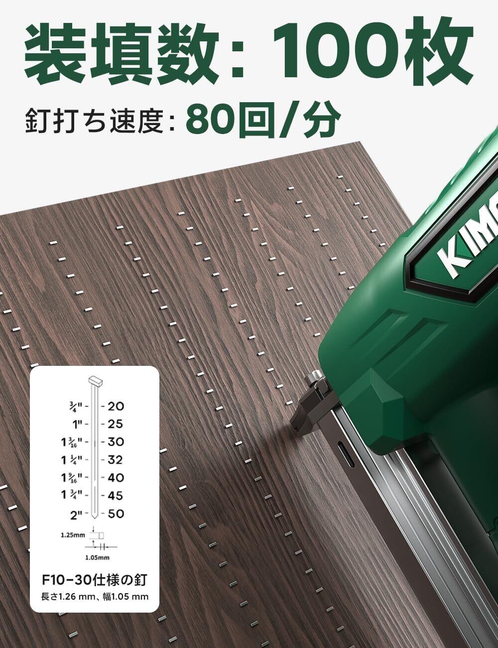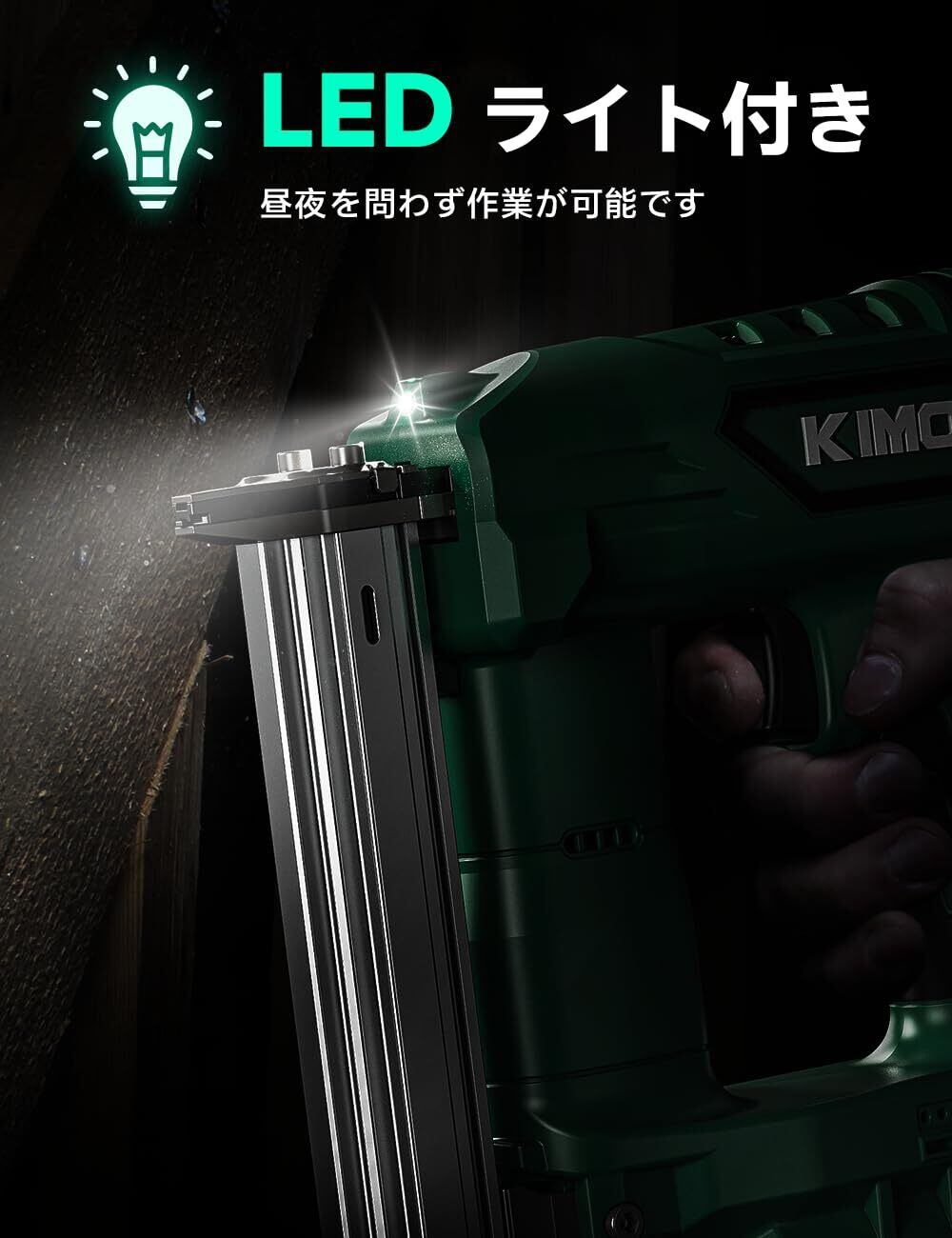 【大容量2.0Ahバッテリー*2&LEDライト|タッカーに求められる信頼性と実用性を搭載】KIMOの充電式タッカーは、12V/2.0Ahの大容量リチウムイオンバッテリーを搭載し、一度の充電で約700本ものネイルを連続打込み可能。さらに、1000回以上の充電サイクルに対応する高い耐久性を持ち、長期間にわたって安定した性能を発揮します。これにより、現場での作業中断を最小限に抑え、効率的な工程管理が実現できます。また、バッテリー残量表示機能を標準装備しているため、いつでもバッテリー状況を確認でき、突然の切れによる作業停止のリスクを回避。安心して現場に集中できる、プロ仕様の高信頼タッカーとして設計されています。さらに、このタッカーには2つの高輝度LEDライトを装備。暗い室内や屋外、照明の少ない現場でも、作業部分を明るく照らし出します。正確な打ち込み位置を確保し、安全性と作業精度を同時に向上させる設計です。コードレスだからこそ叶う自由度と、長時間使用にも耐える実力を兼ね備えたこのタッカー。建築現場、家具製造、リフォーム、DIYなど、さまざまなシーンにおいてあなたの作業を強力にサポートします。
