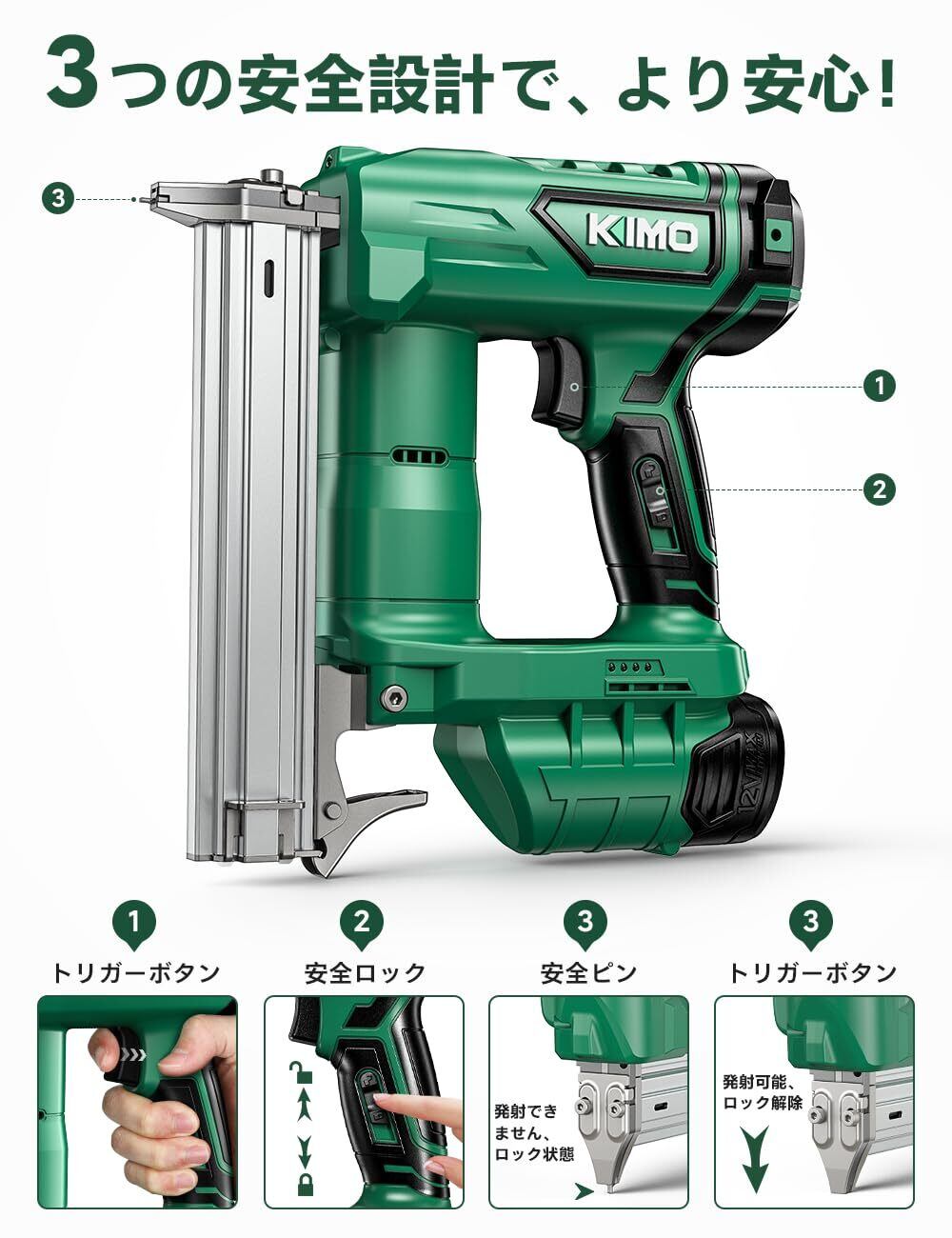 【誤射防止装置|プロも信頼するピンタッカー】KIMOの電動ピンタッカーは、安全性と作業の確実性を両立させた一台です。本体には誤射防止装置が搭載されており、コンタクトアームをしっかり押し下げないと動作しない仕組みになっています。これにより、意図せずネイルを発射してしまうリスクを大幅に軽減し、初心者からプロまで安心して使えるピンタッカーとして設計されています。さらに、このピンタッカーには三段階の操作プロセスを取り入れています。まず、ネイルの前端を素材に押しつけ、次にカートリッジを押し込み、最後にロックレバーで固定することで、一連の動作の中でミスを防ぎ、正確な打込みを実現します。このような設計により、高い精度と安定した作業性を確保しています。また、メンテナンス面にも配慮し、紙詰まりやトラブル時の解除用にアレンレンチが標準付属。ちょっとした詰まりも自分で簡単に解消でき、現場での作業効率を落としません。KIMOのピンタッカーは、ただ速く打つだけでなく、「安全」「確実」「簡単」を追求した、現代の職人・ユーザーに寄り添う工具です。