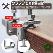 クランプ内部に固定したい部品や素材を設置し、それに合わせてボルトを締めて固定するだけです。位置決め用のナットとワッシャがついています。