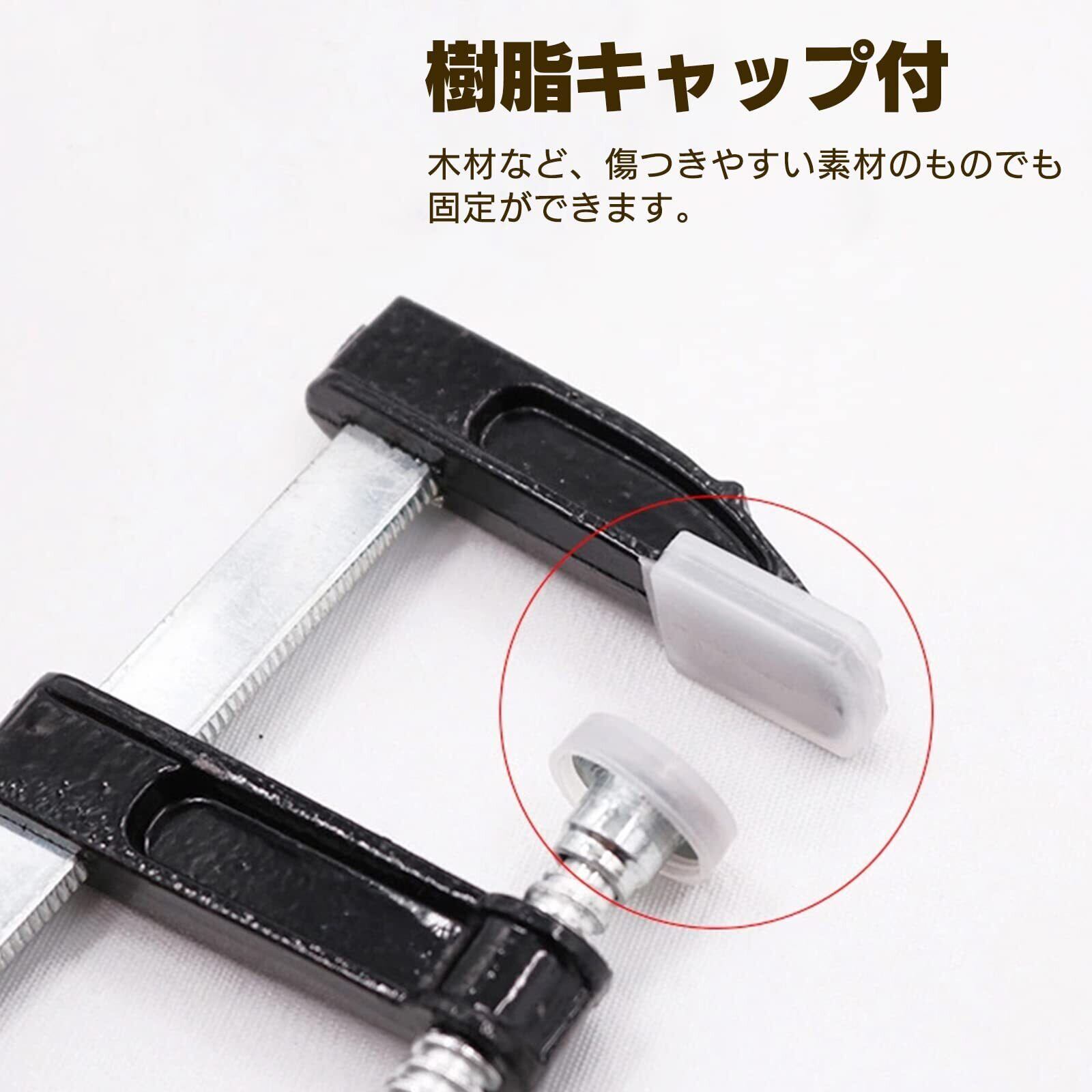 接着部分には保護用の樹脂キャップが装着されており、木材など傷つきやすい素材の固定にも最適です。高温素材を扱う場合はキャップを外してご使用ください。錆びにくいスチール製のf 型クランプ(開口幅約300mm)は、しっかりとした固定力を持ち、厚みのある部材の保持にも対応可能です。