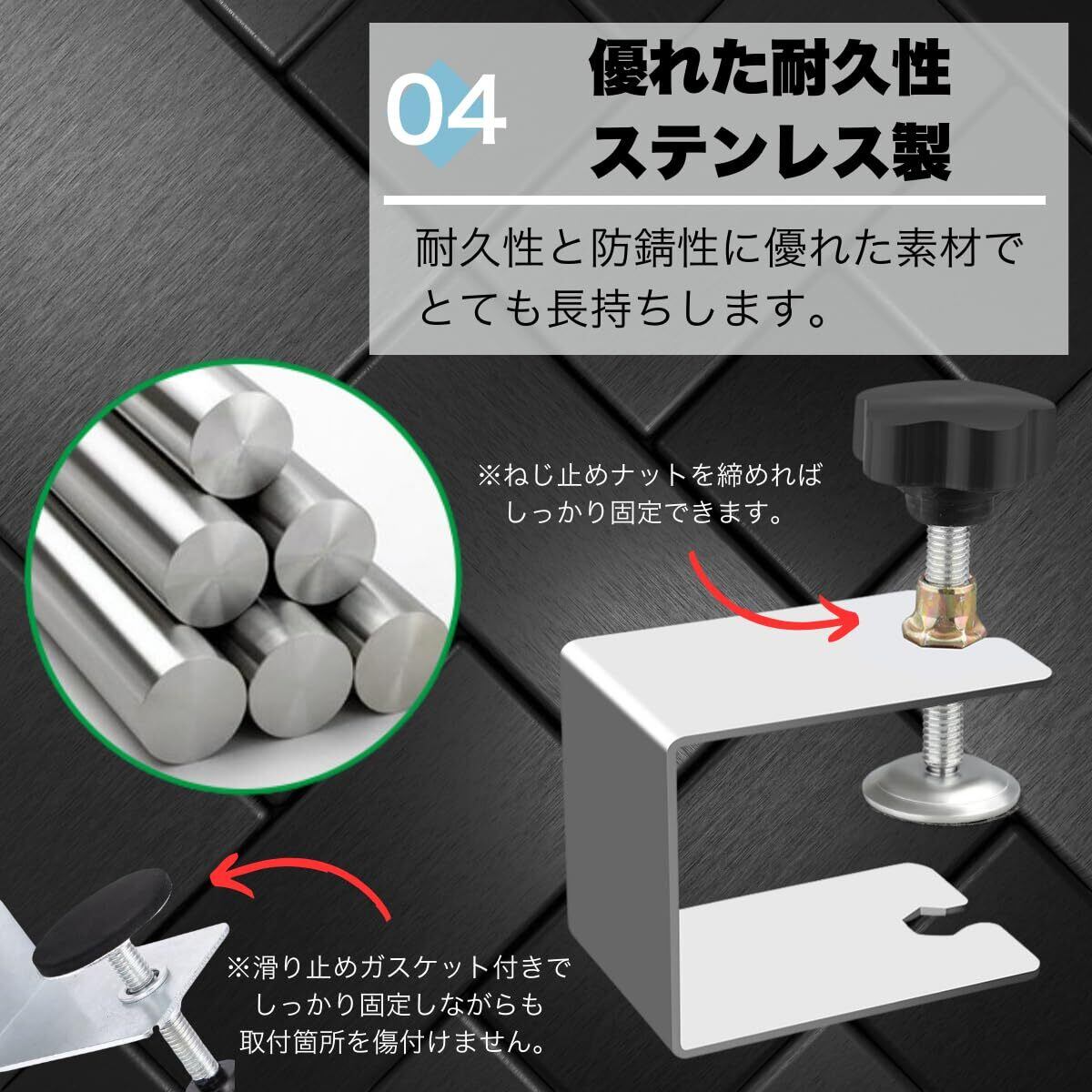 【安定した固定力】ステンレス素材と精密な製造技術により、安定した固定力を発揮します。付属の滑り止めガスケットを取り付けることで、滑り止め効果はもちろん、設置面へ均一に力が加わり、ガスケットが緩衝材となって対象物を傷つけにくくなる挟み込み金具です。