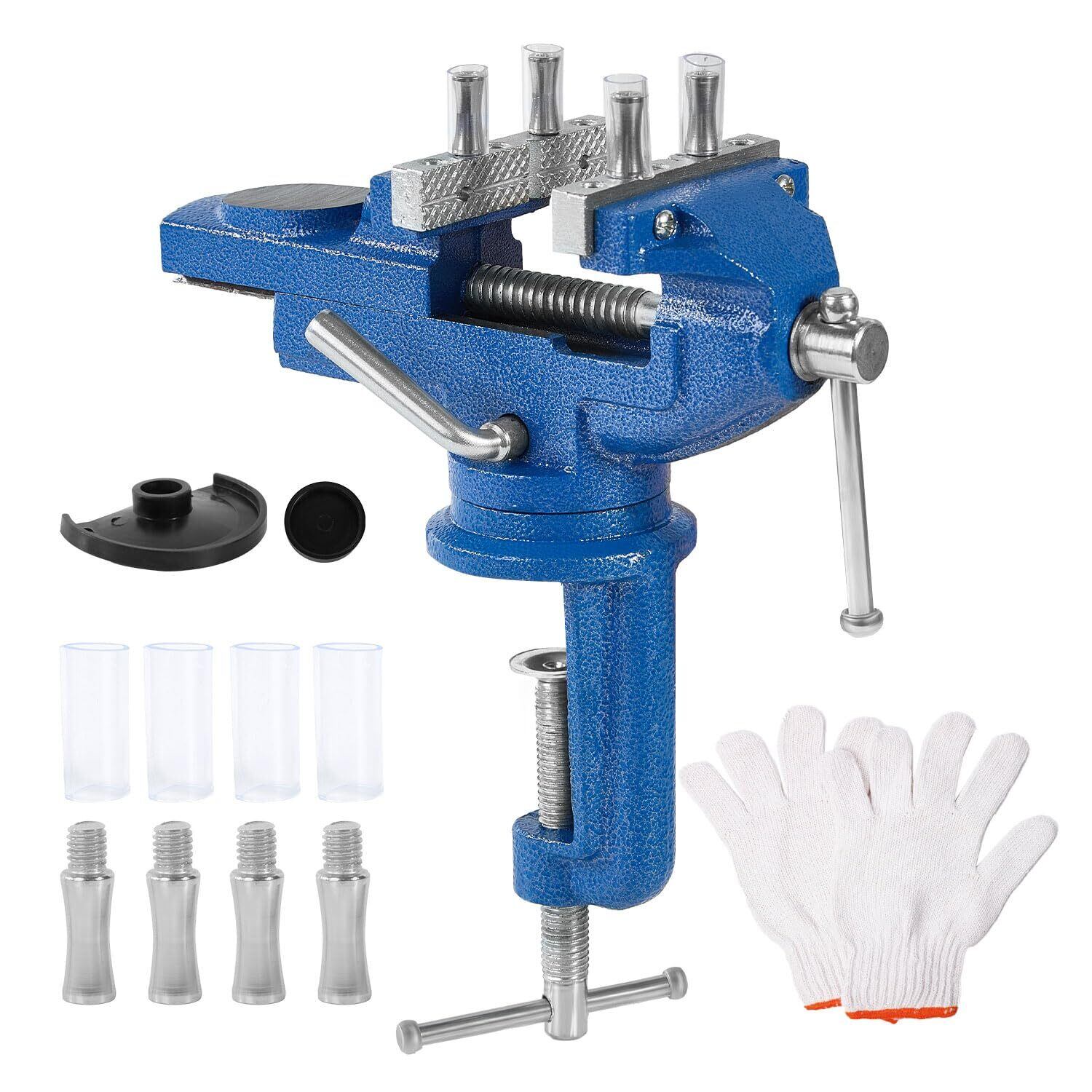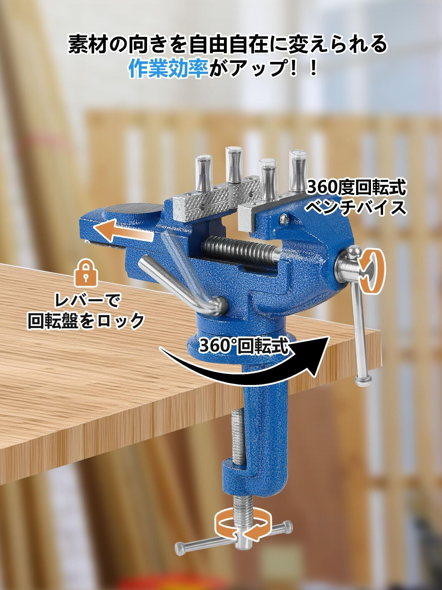 【サイズ詳細】本体重量1.8kg、360°回転盤。クランプの最大開口幅64mm クランプのグリップ力は300kg、【セット内容】青卓上万力*1、手袋x1、滑り止めマットx2、クランプポスト4本と滑り止めゴムカバー4枚付き
