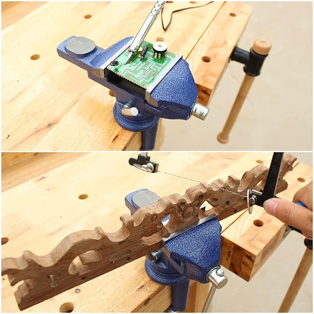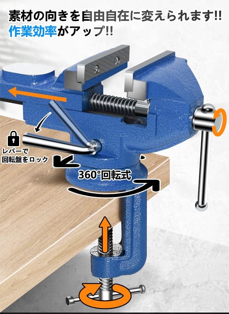 特徴:360度回転式ベンチバイス、回転台付きで、加工に便利、作業性がアップできます。取り付けや外すも自由で、細かい作業に最適です!