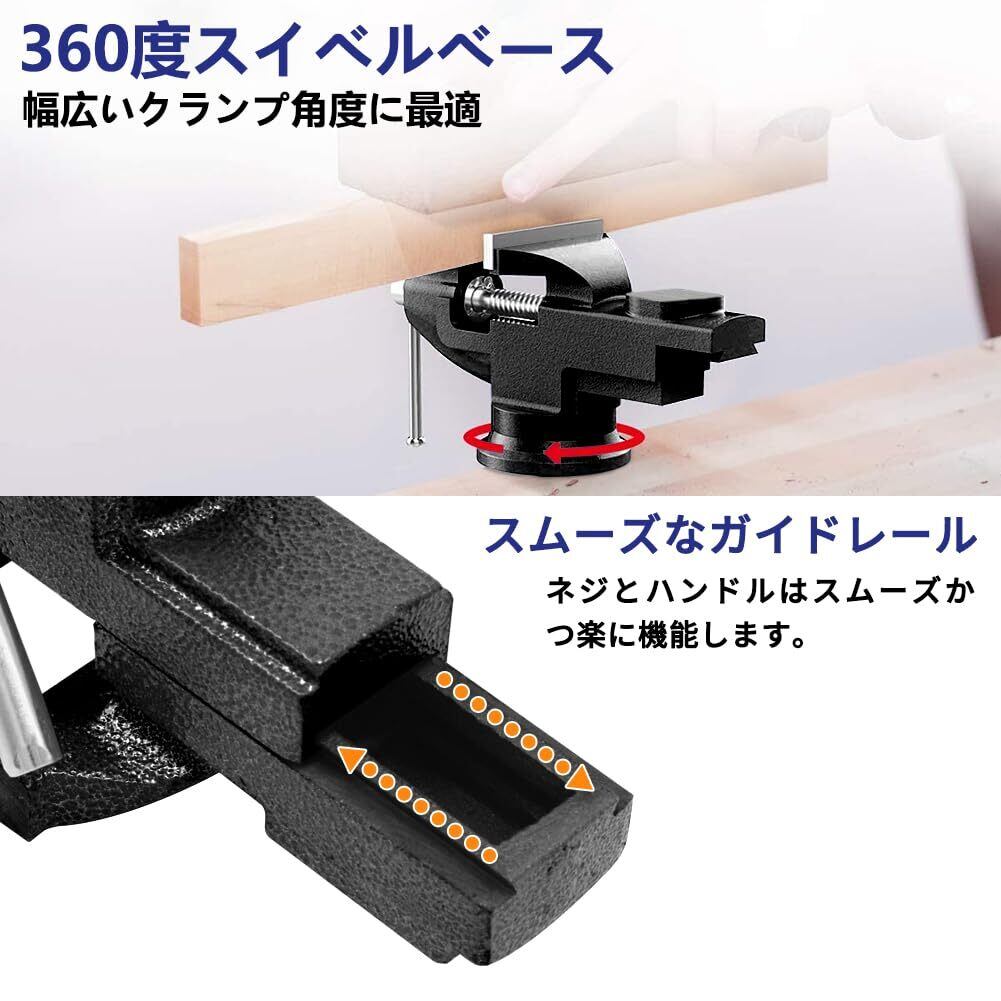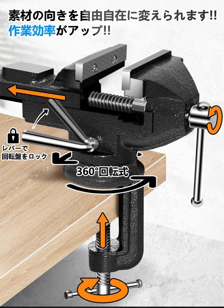 特徴:360度回転式ベンチバイス、回転台付きで、加工に便利、作業性がアップできます。取り付けや外しも自由で、細かい作業に最適です!