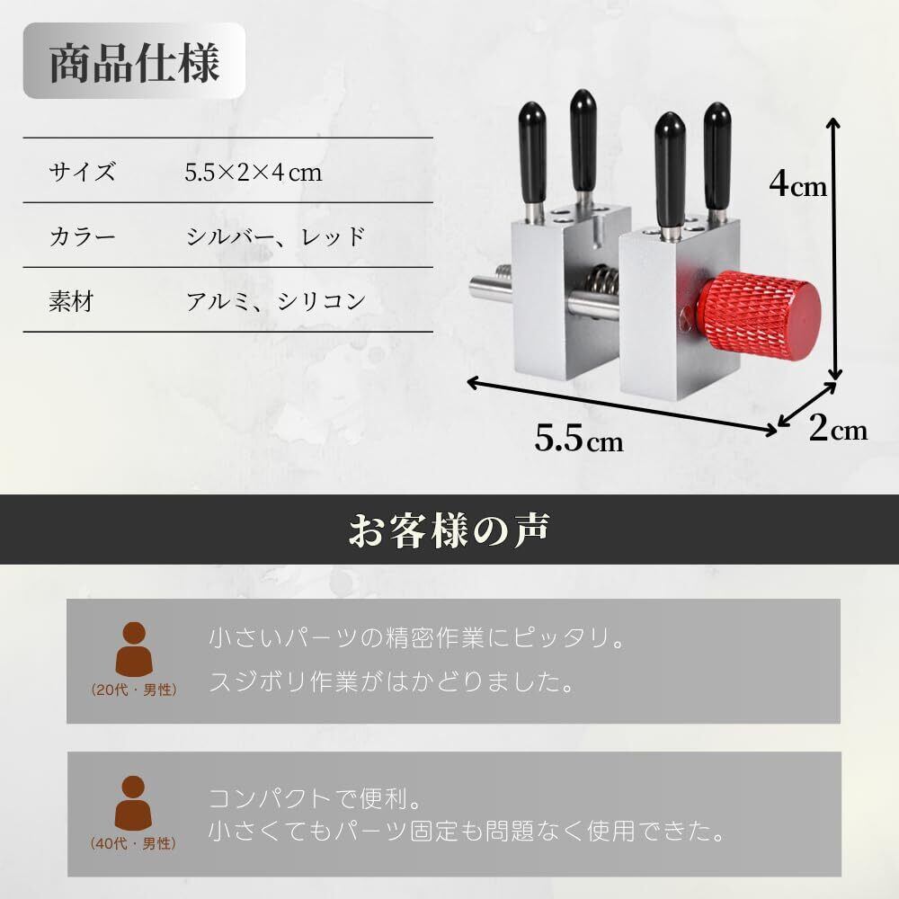 【自在に調整可能なクランプ機能】このミニバイスはダブルレール設計と円形手ねじを採用し、クランプ幅を最大30mmまで微調整可能です。取り外し可能な固定ピンが付属しており、様々な形状やサイズのパーツをしっかり保持します。さらに内蔵された強力なバネにより微細部品や円弧状のパーツも簡単かつ確実に挟むことができ、作業ストレスを軽減します。