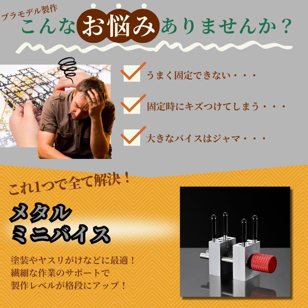 【精密作業を快適にするミニメタルバイス】ミニサイズながら高精度なアルミ合金製の卓上バイスで、プラモデルやガンプラなどの模型製作時に大活躍!スジボリや塗装、ヤスリがけ、切断、穴あけなど細かな作業もパーツをしっかり固定して安定感抜群です。小型で軽量なため卓上スペースを圧迫せず、模型製作の効率と精度を大幅にアップさせます。