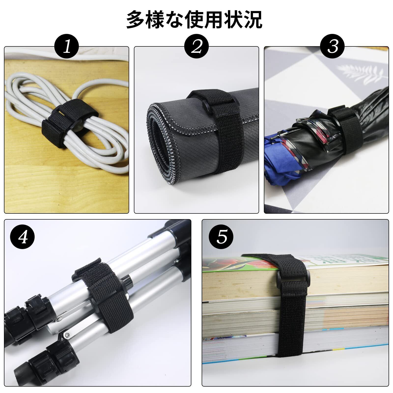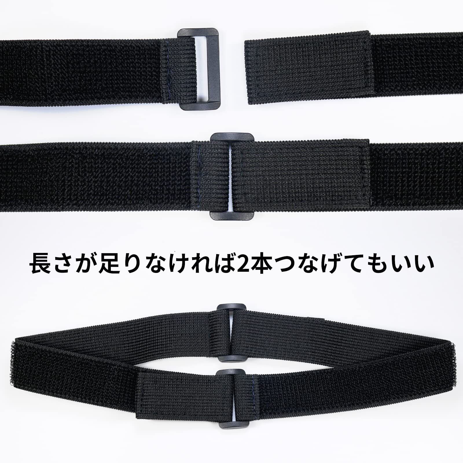 このマジック式伸縮ベルトは、幅2.5cm、全長5.0cmのコンパクトなサイズで、6本セットでお届けします。素材は伸縮性に優れたゴムで、ケーブルや配線などの固定に最適です。パッケージは6本セットで、ブラックの1色が用意されています。重さは8.6gと軽量で、持ち運びも容易です。