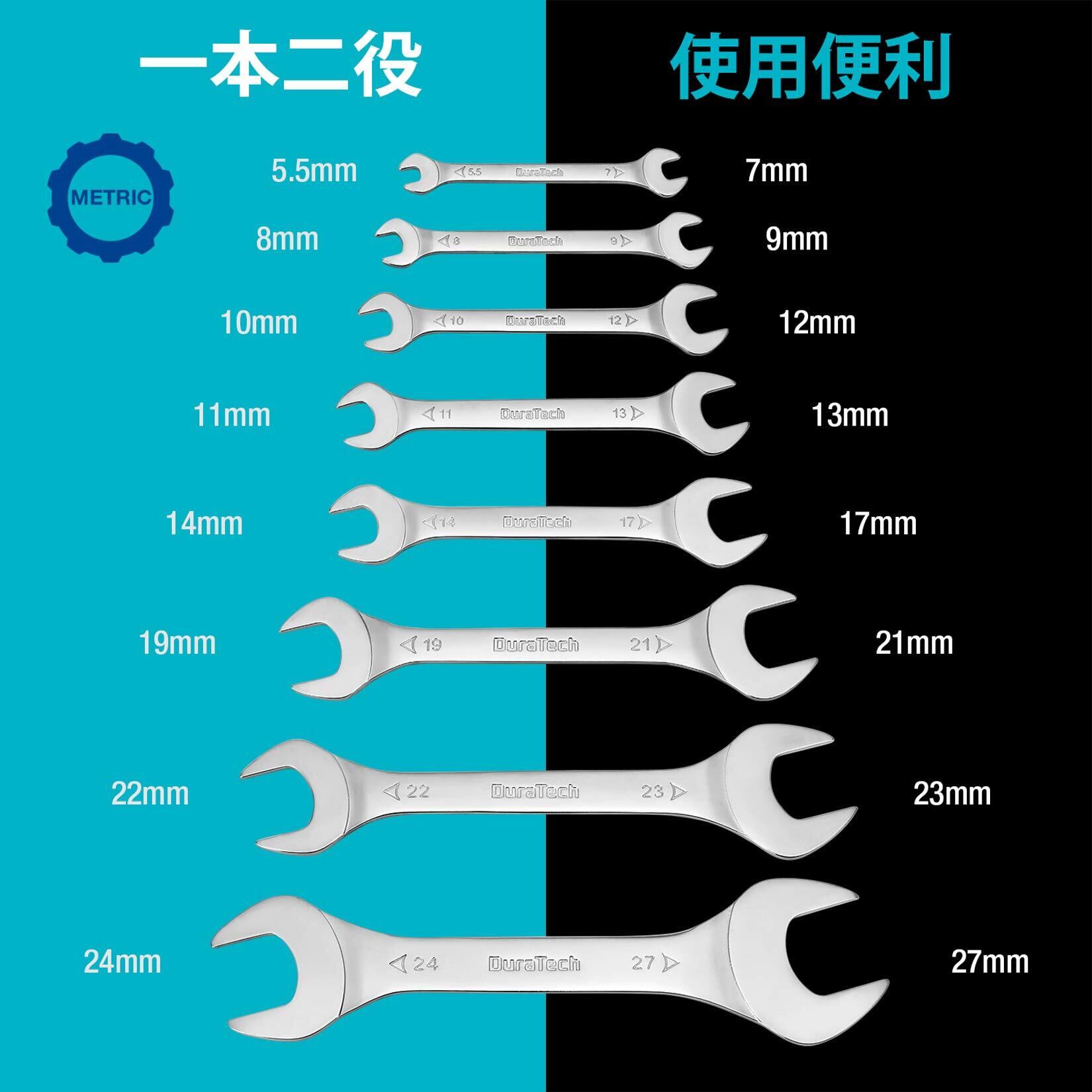【セット内容】ショートタイプ、薄型両口スパナ8本組。5.5x7mm、8x9mm、10x12mm、11x13mm、14x17mm、19x21mm、22x23mm、24x27mm各1点。