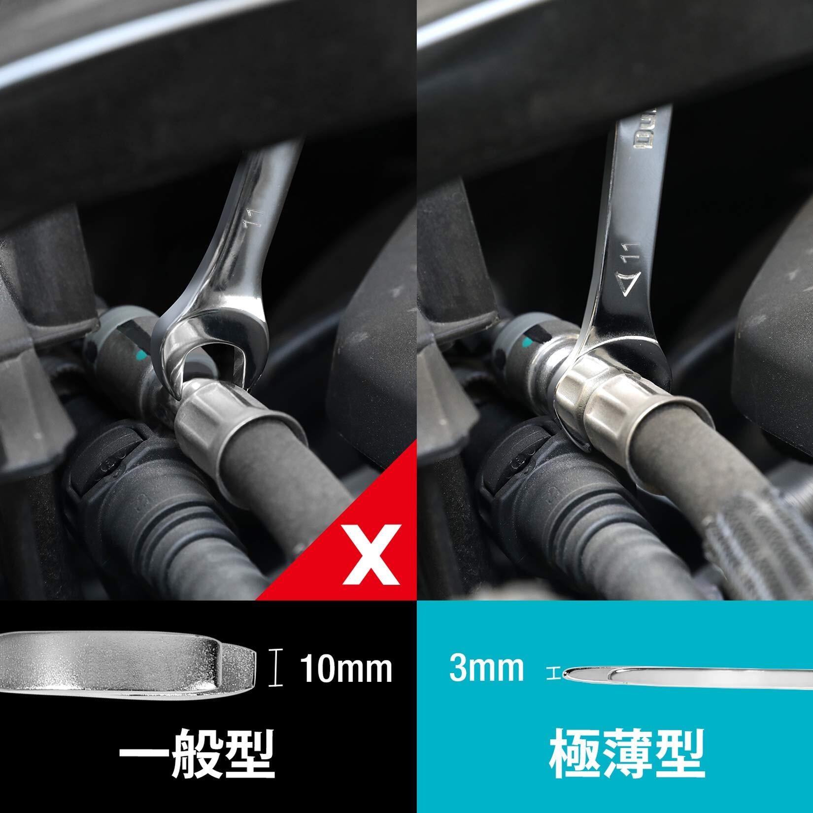 【使用勝手】1本2サイズで多くのネジ作業に対応できて、番手も刻印されて一見ですぐ分かります。厚み僅か3mmの薄口スパナなので、狭いスペースでのナットの締めつけや緩めに最適です。