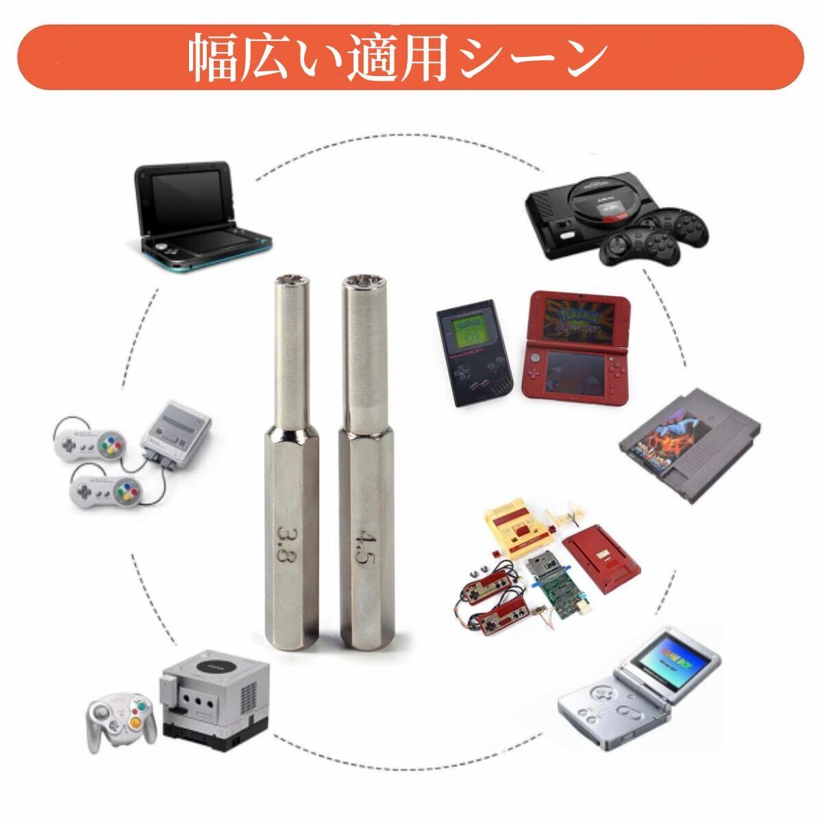 4.5mmビット対応機種:NES-101,SNES-001,SNES-101,Nintendo64,Nintendo Game Cube;Sega Master System, Sega Genesis System, Sega 32x System game cartridge; Virtual Boy, Game Gear。