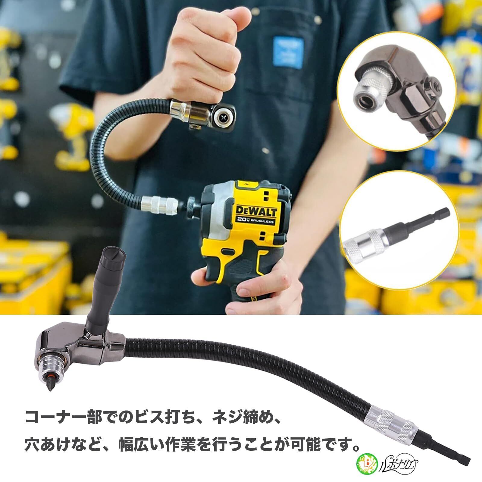 90度のL型アングルとフレキシブルシャフトで、様々な角度に対応することができ、コーナー部でのビス打ち、ネジ締め、穴あけなど、幅広い作業を行うことが可能です。