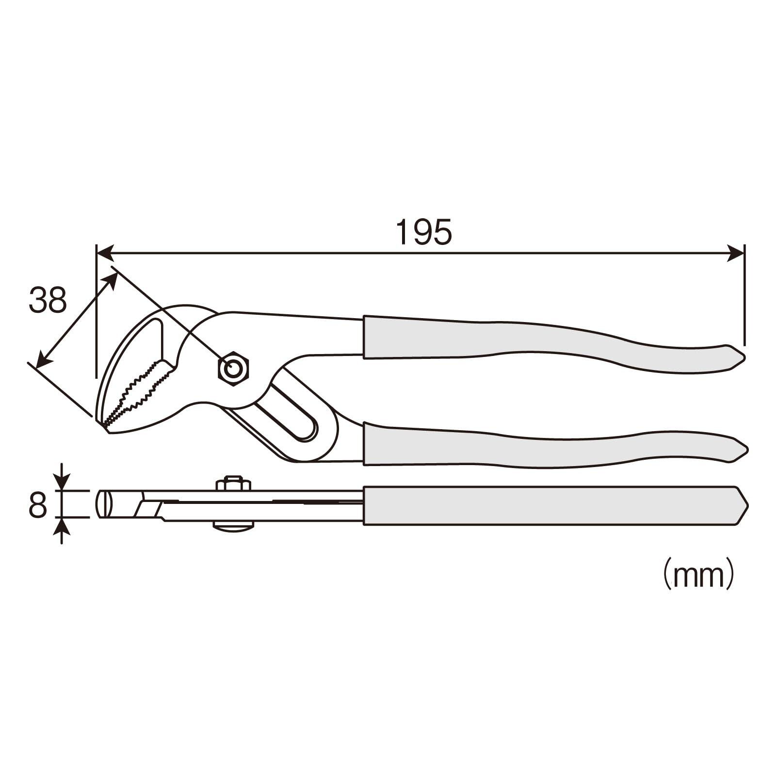 全長195mmの小型タイプのウォーターポンププライヤー。狭いアウトレットボックス内でも楽に作業できます。